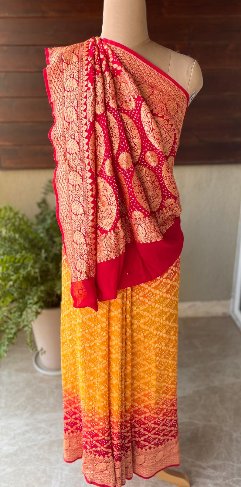 Ombre Shaded Red & Kesari Yellow color Pure bandhani saree with handwoven banarasi border