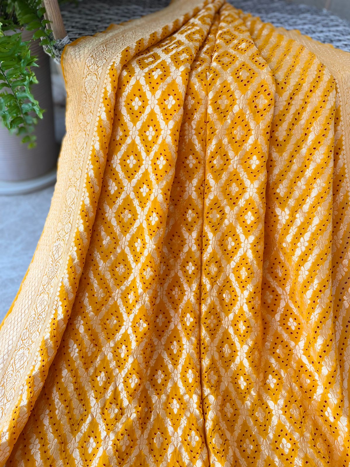 Kesari Yellow color pure bandhani saree with handwoven banarasi border