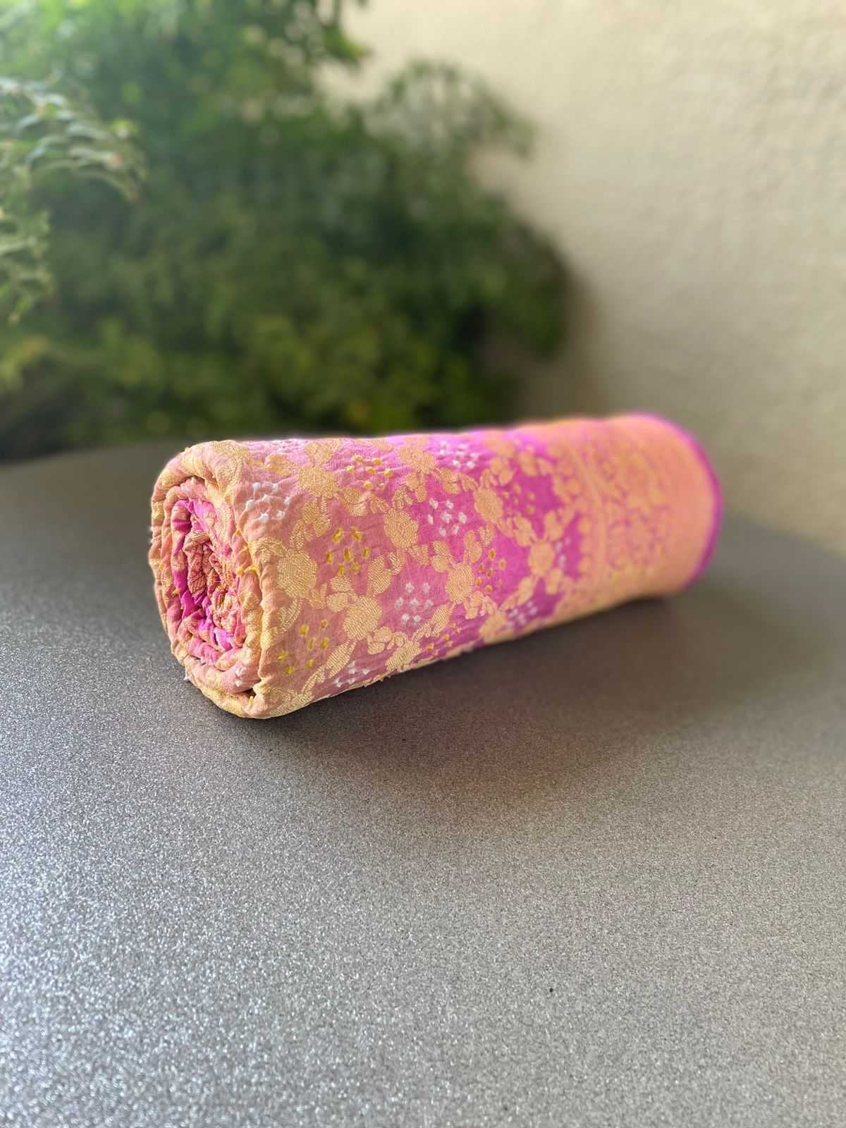 Fabric: Pure Georgette Rai Bandhej with Handwoven golden zari Banarasi weave