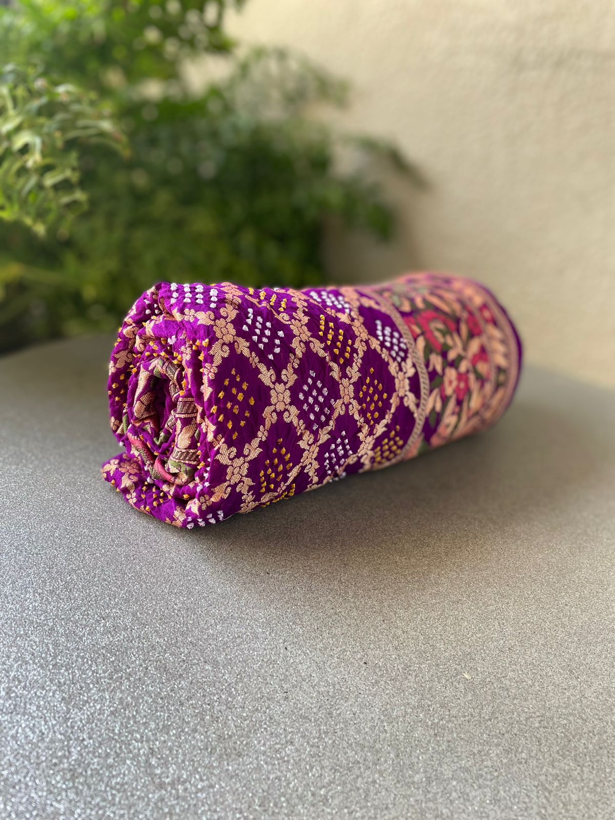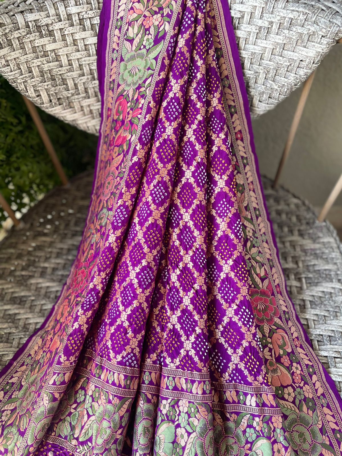 Purple color Pure Bandhani dupatta with Banarasi Meenakari Weaving with Luxury Motifs