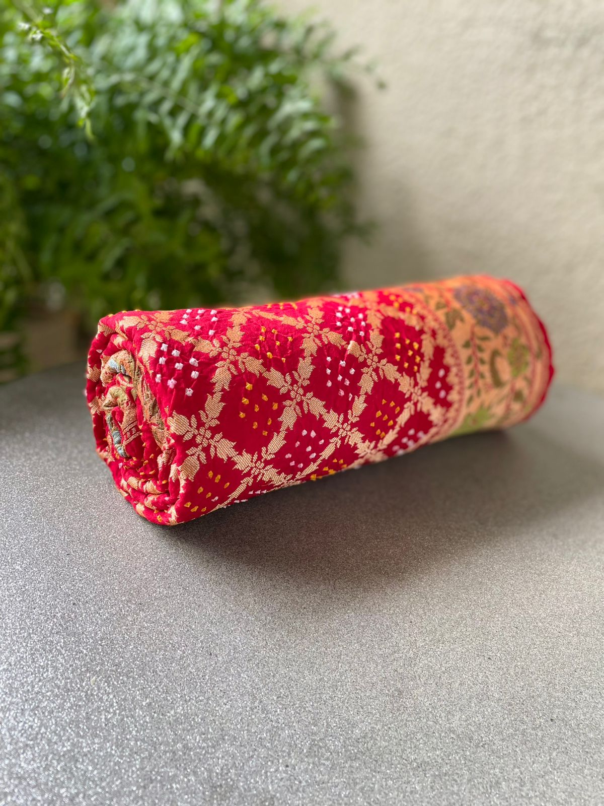 Red color pure bandhani dupatta with handwoven Meenakari banarasi weaving and Luxury Motifs