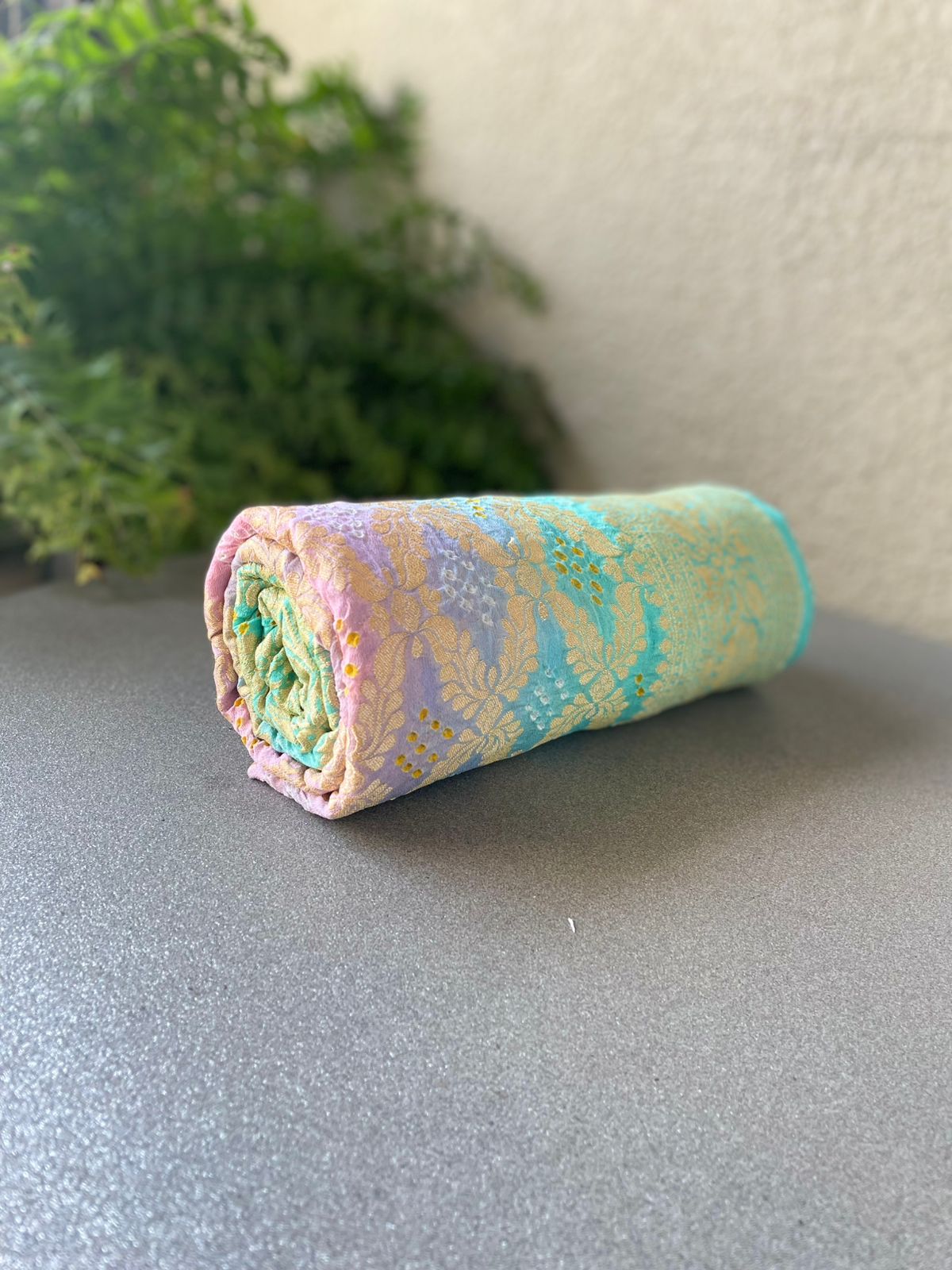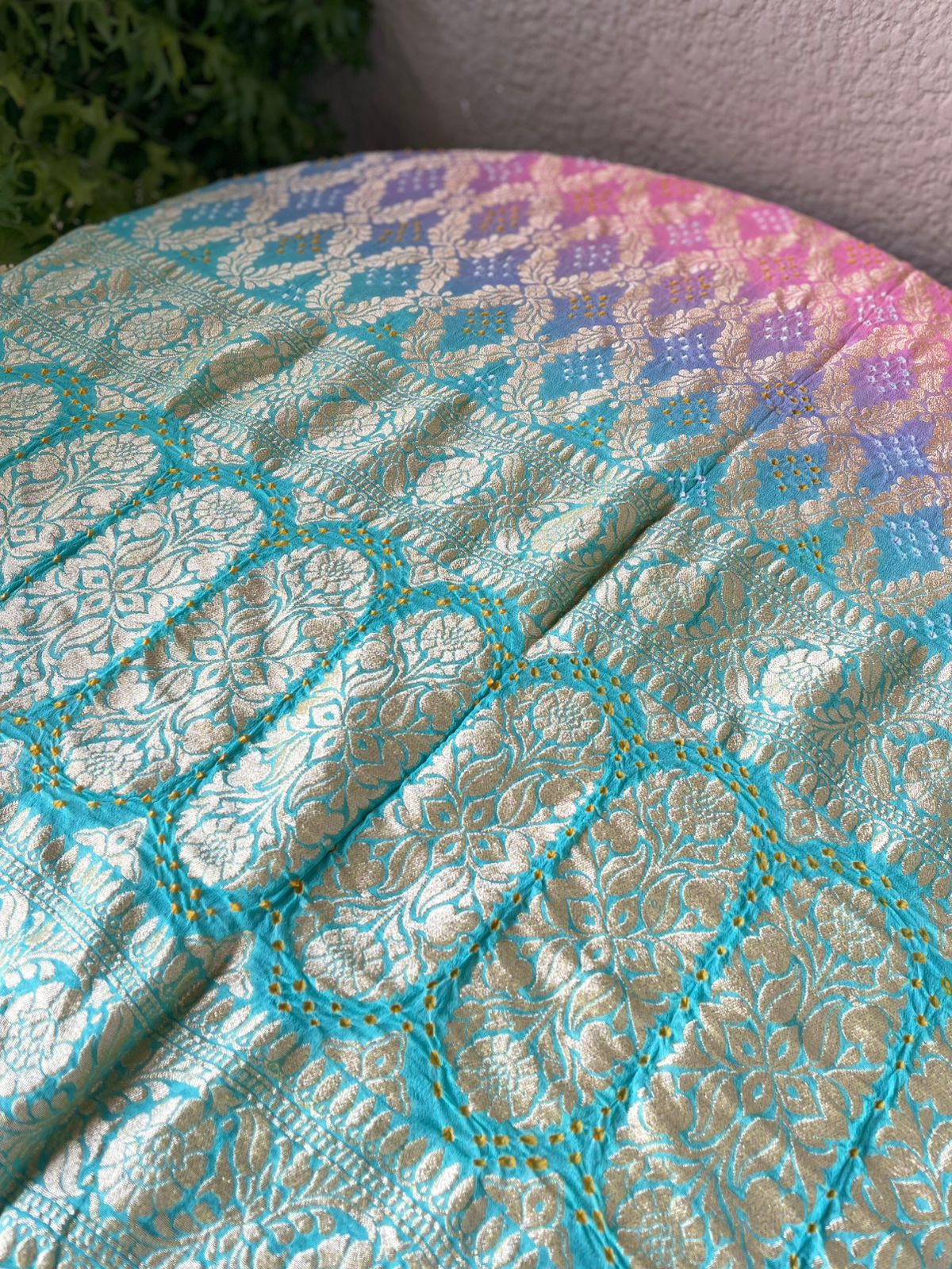 Ombre Shaded Turquoise Blue & Peach color Pure Bandhani dupatta with Banarasi border