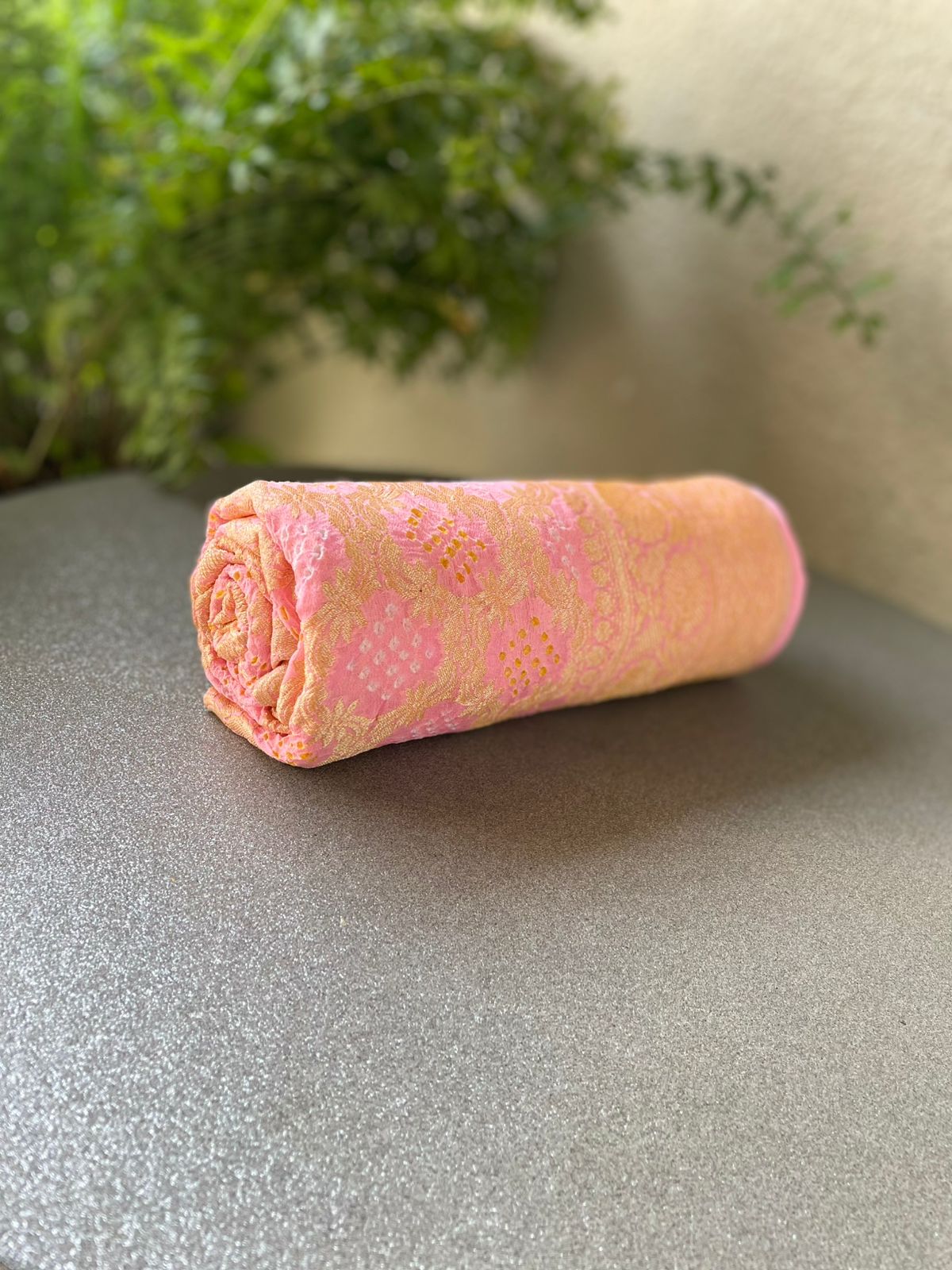 Fabric: Pure Georgette Rai Bandhej with Handwoven golden zari Banarasi weave