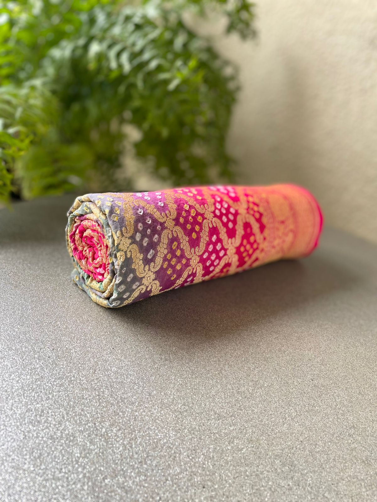 Fabric: Pure Georgette Rai Bandhej with Handwoven golden zari Banarasi weave