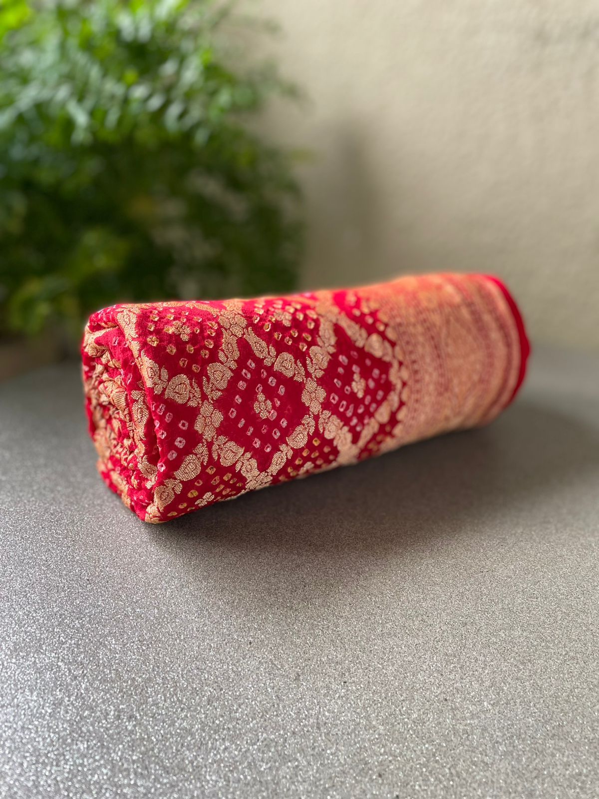 Fabric: Pure Georgette Rai Bandhej with Handwoven golden zari Banarasi weave