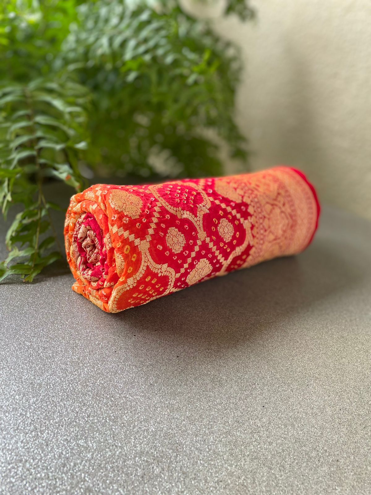 Fabric: Pure Georgette Rai Bandhej with Handwoven golden zari Banarasi weave