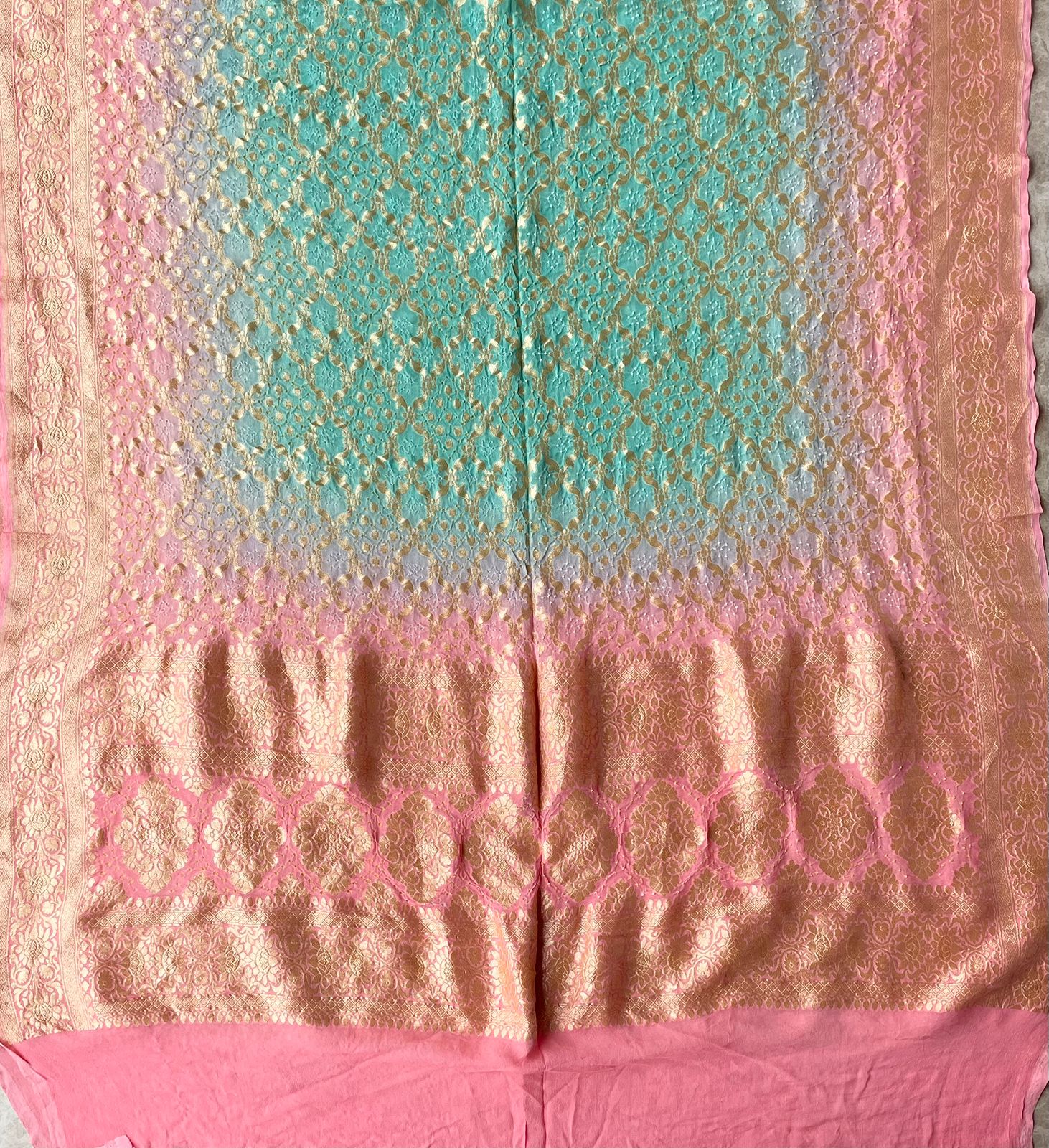 Fabric: Pure Georgette Rai Bandhej with Handwoven golden zari Banarasi weave
