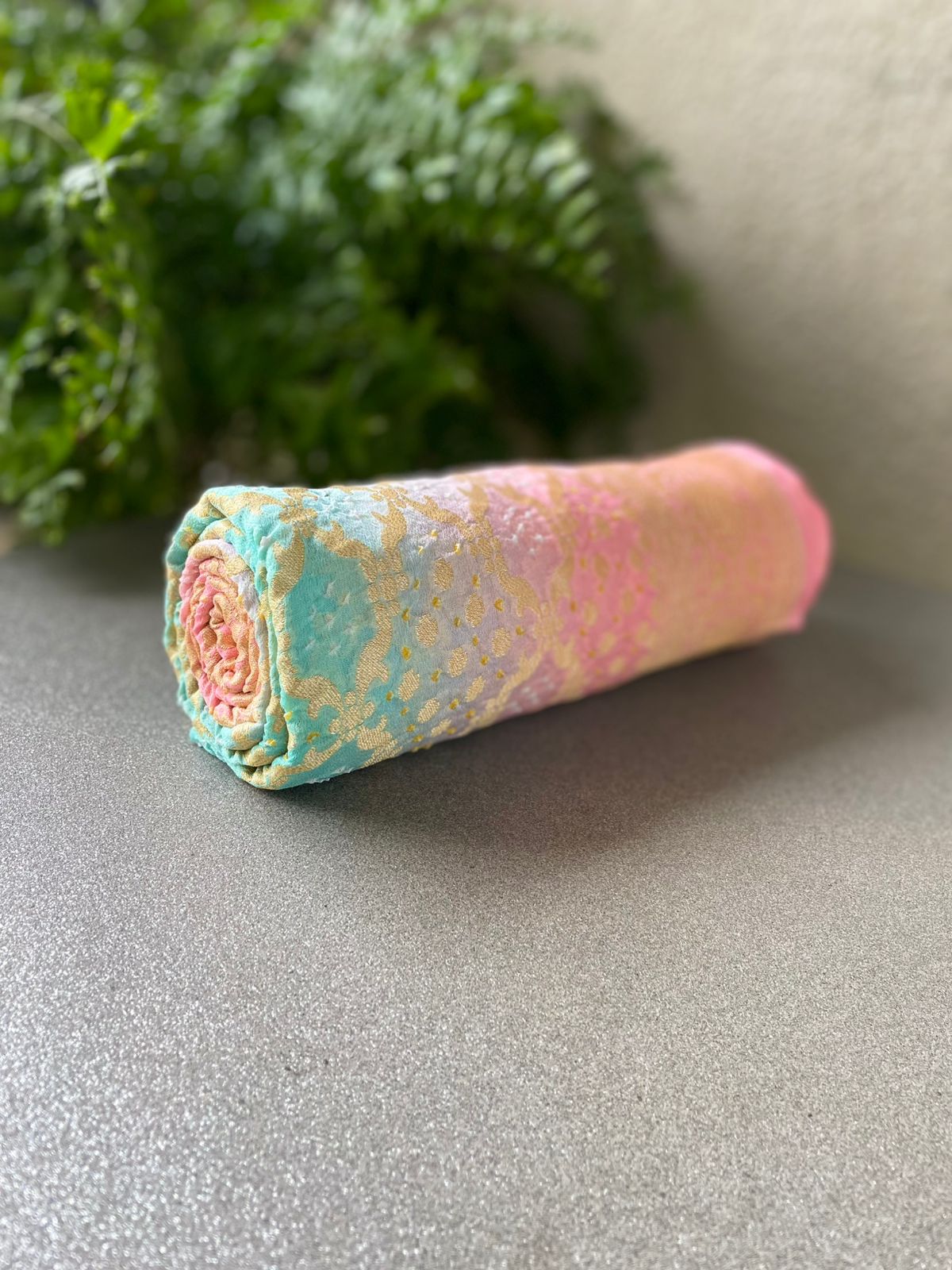 Ombre Shaded Peach & Turquoise Blue color Pure Bandhani dupatta with Banarasi Weaving