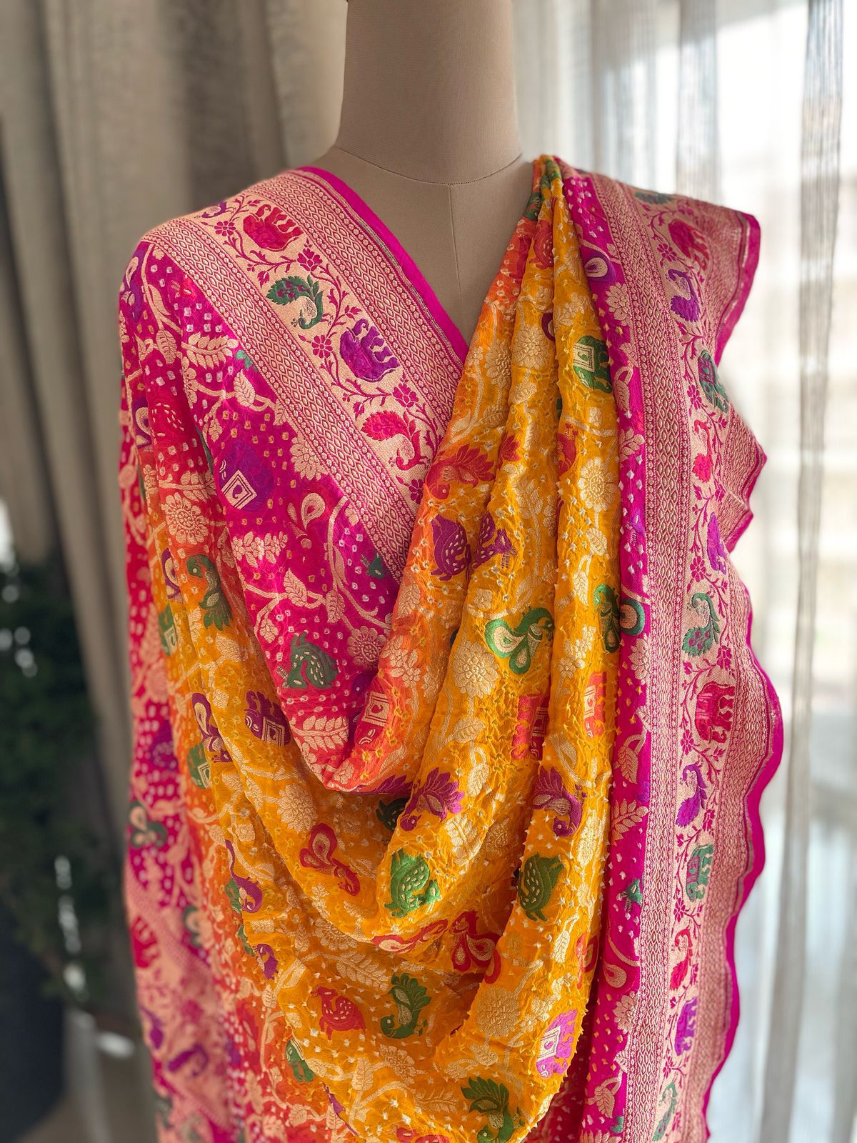 Ombre Shaded Fuchsia Pink & Kesari Yellow color Pure Bandhani dupatta with Banarasi Meenakari Weaving and Luxury Motifs
