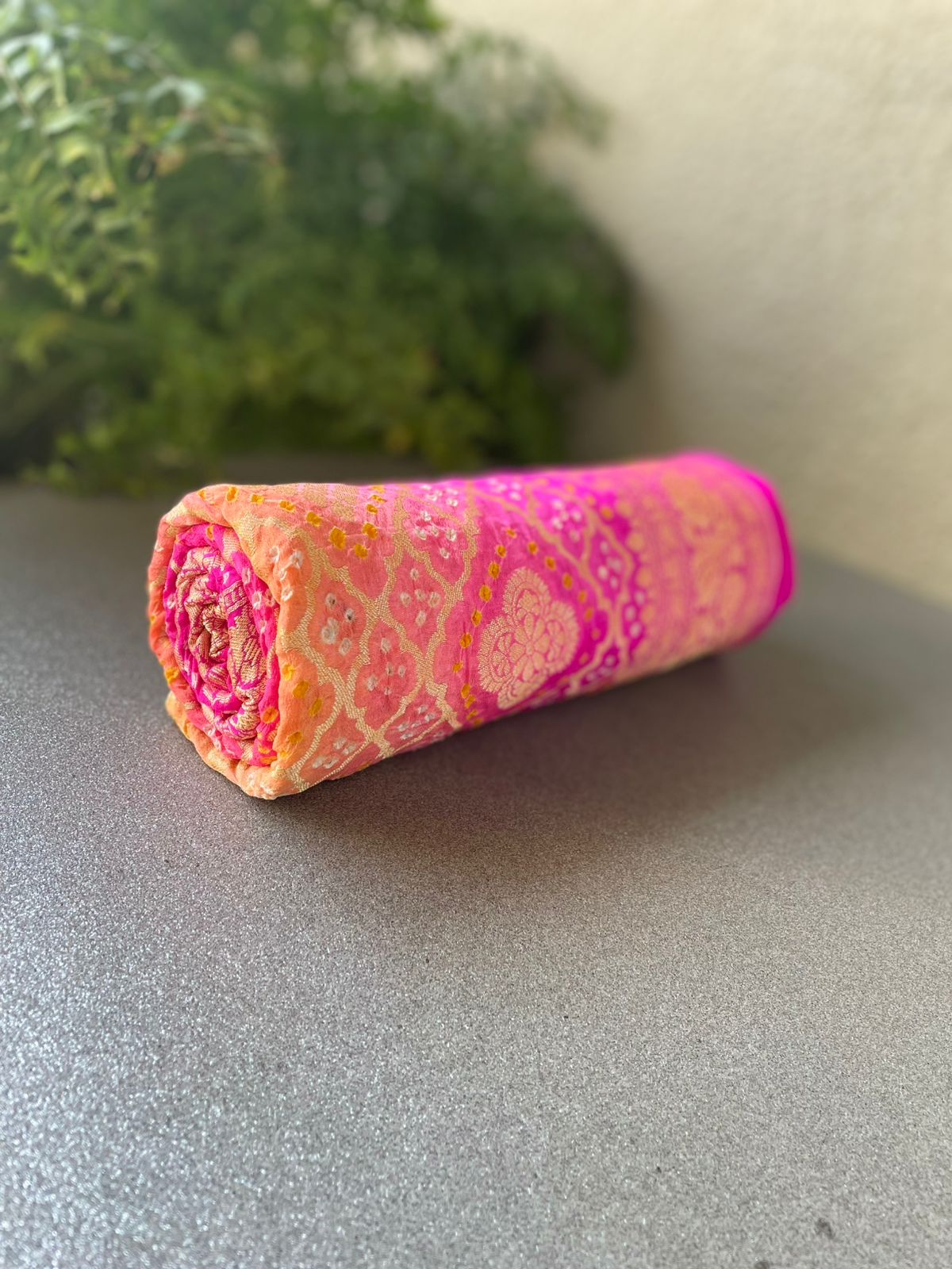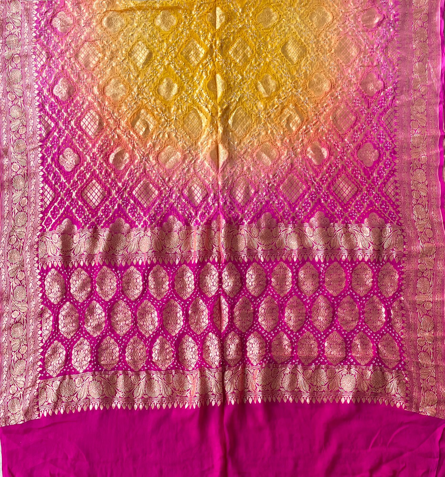 Ombre Shaded Fuchsia Pink & Kesari Yellow color Pure Bandhani dupatta with handwoven zari banarasi border