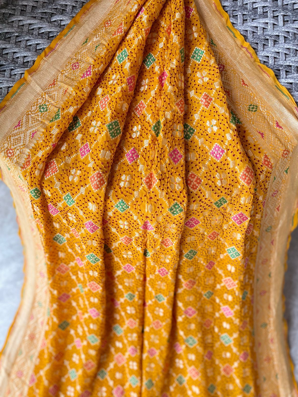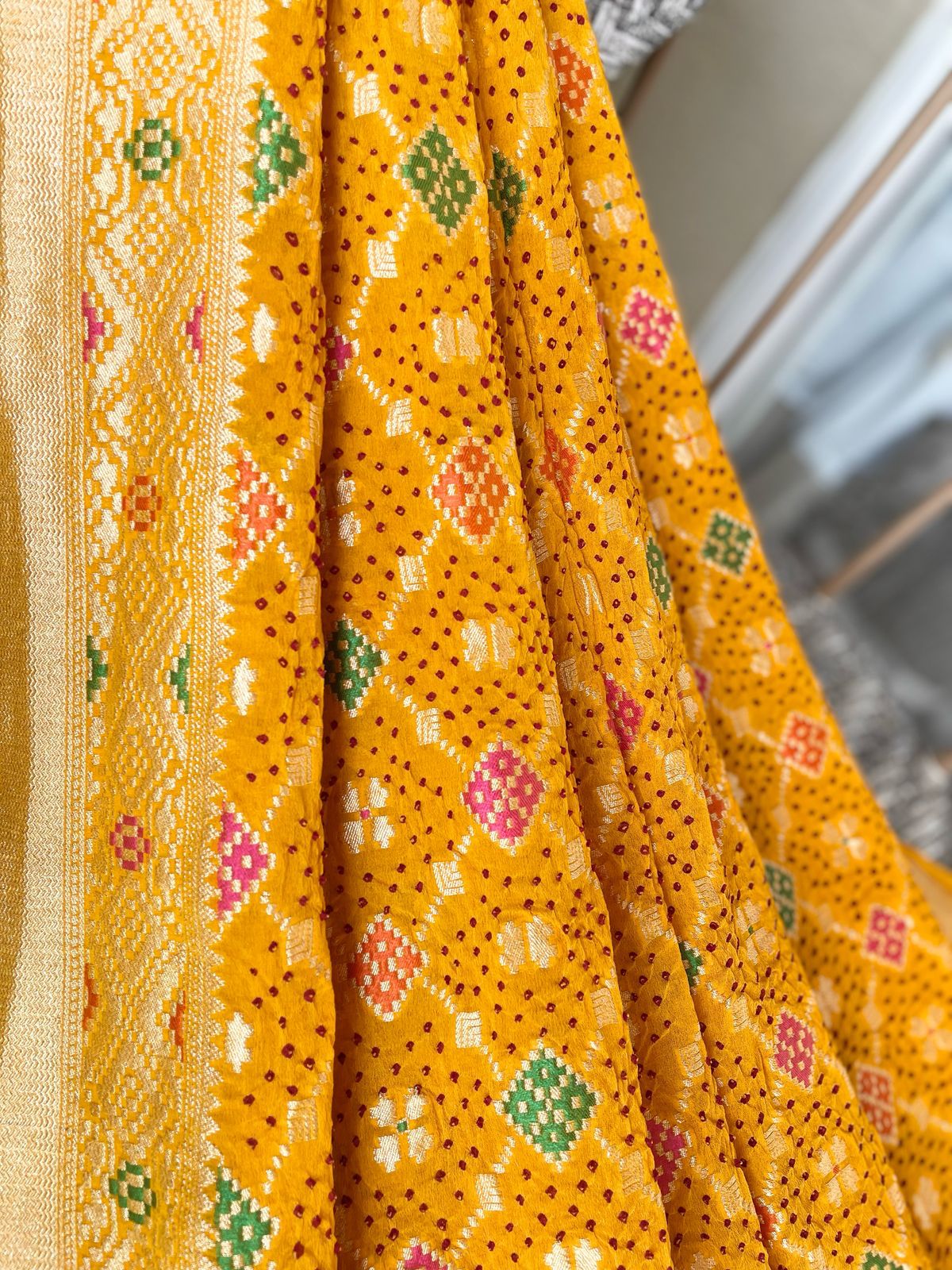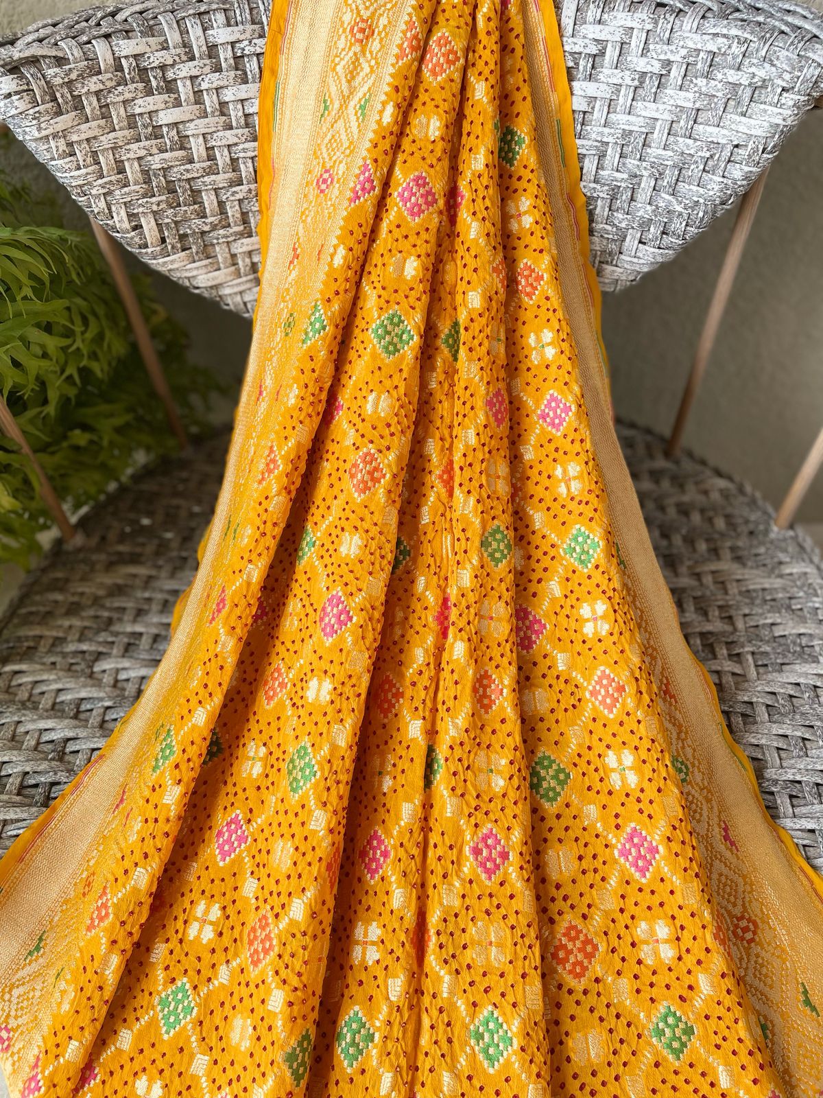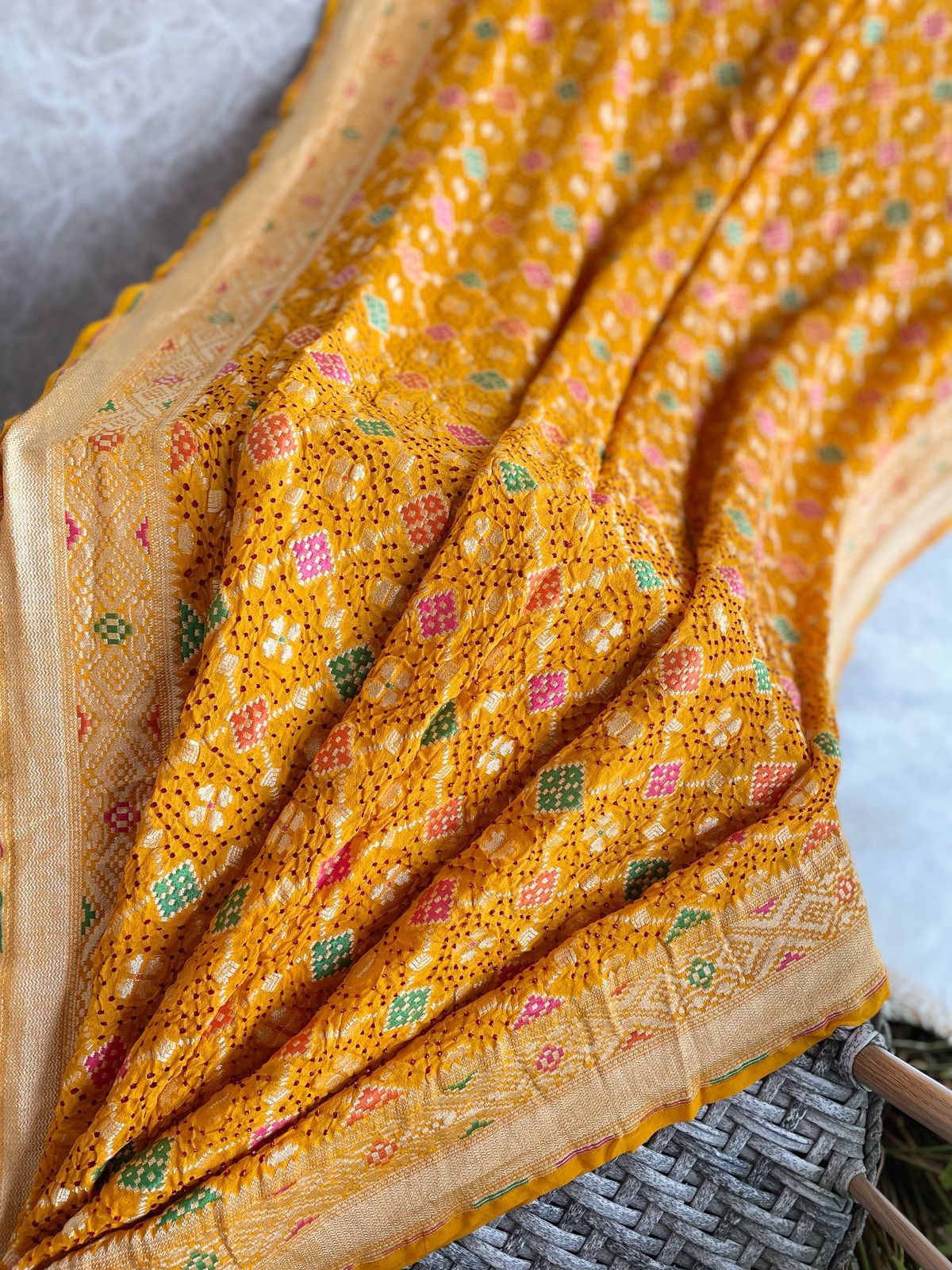 Kesari Yellow Color Pure Bandhani Saree with handwoven meenakari banarasi border