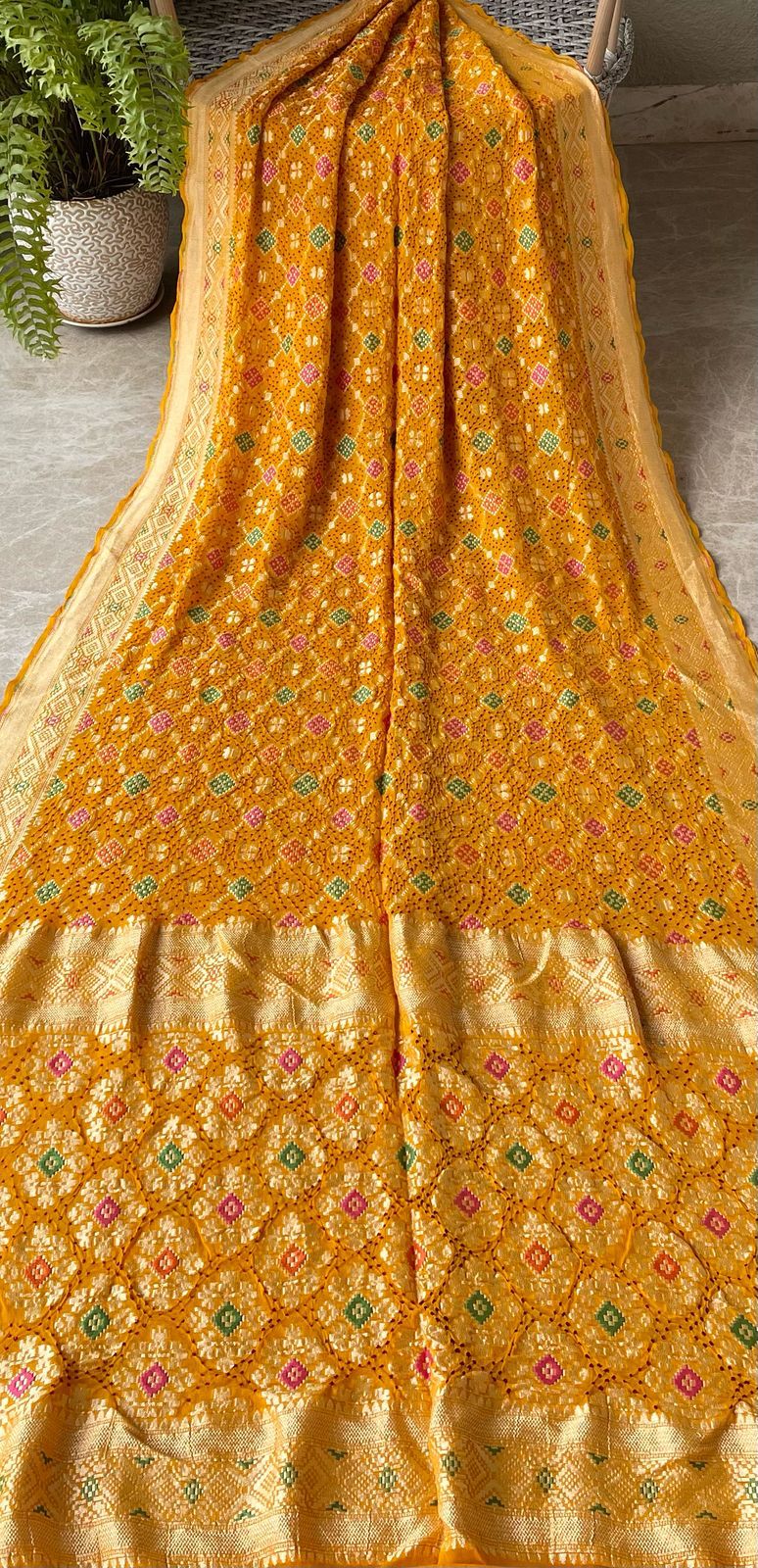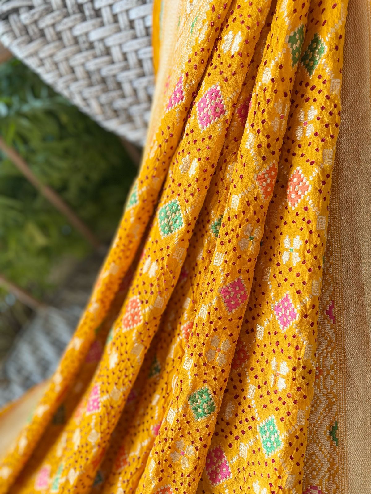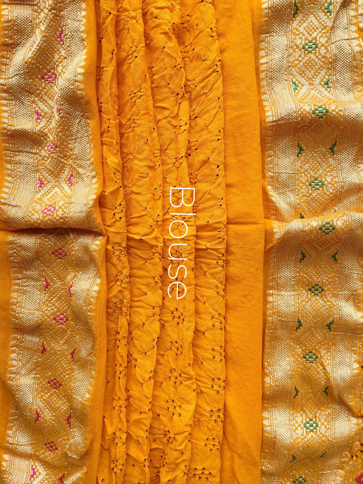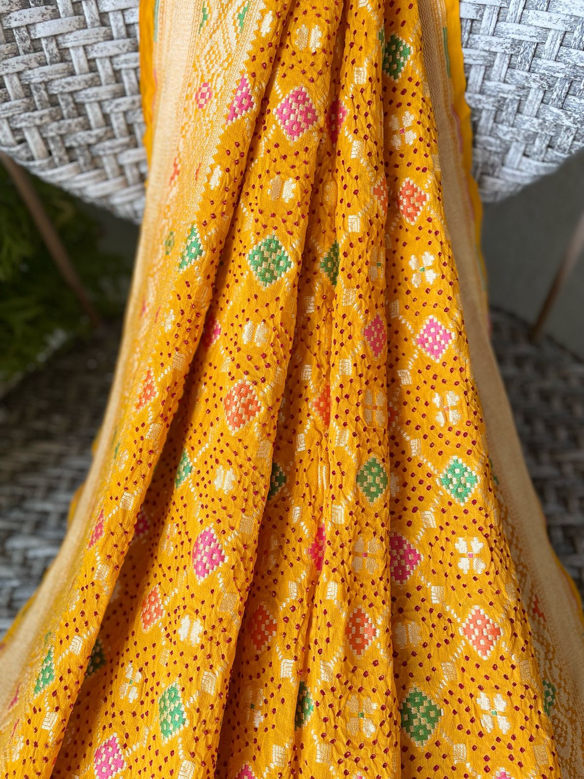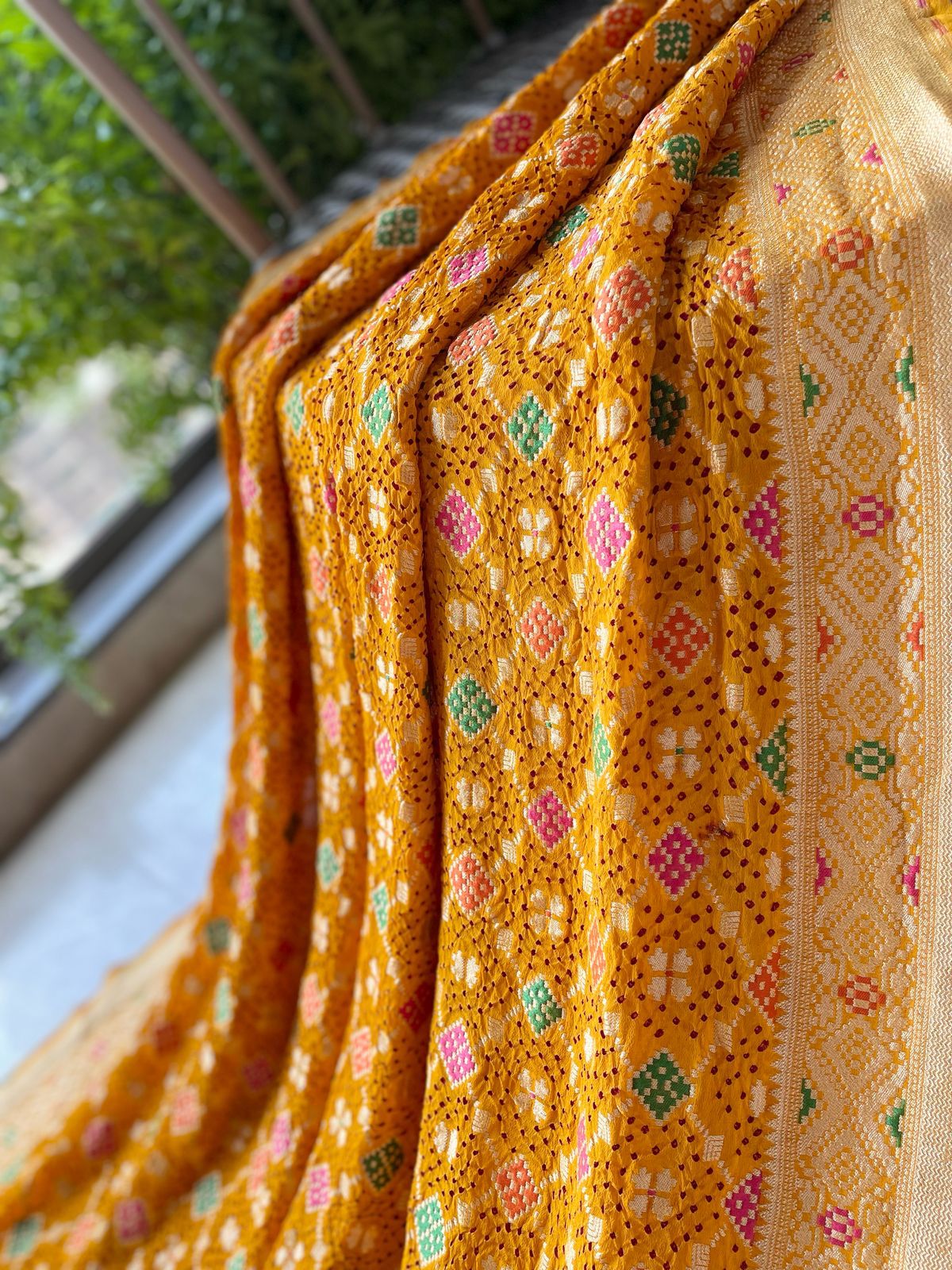Kesari Yellow Color Pure Bandhani Saree with handwoven meenakari banarasi border