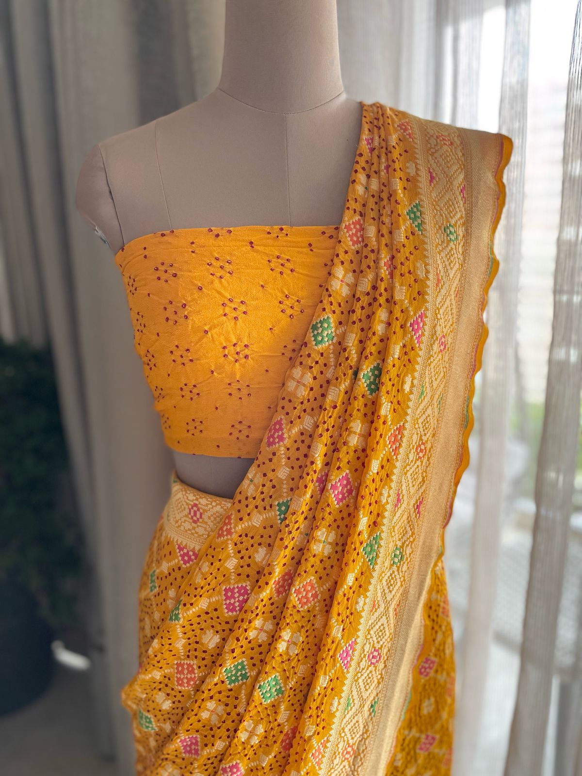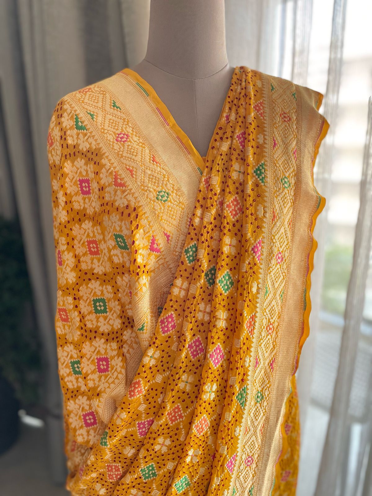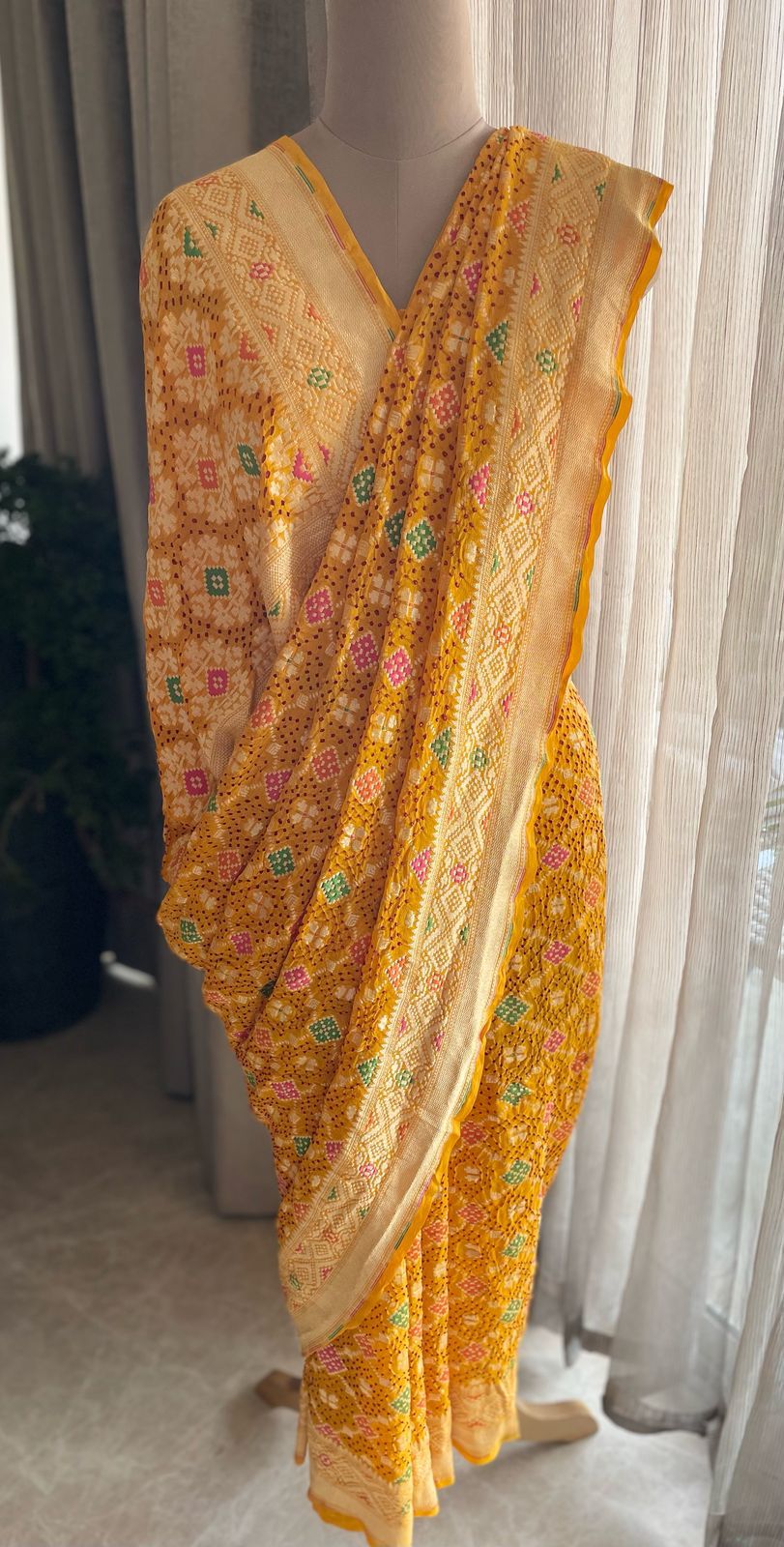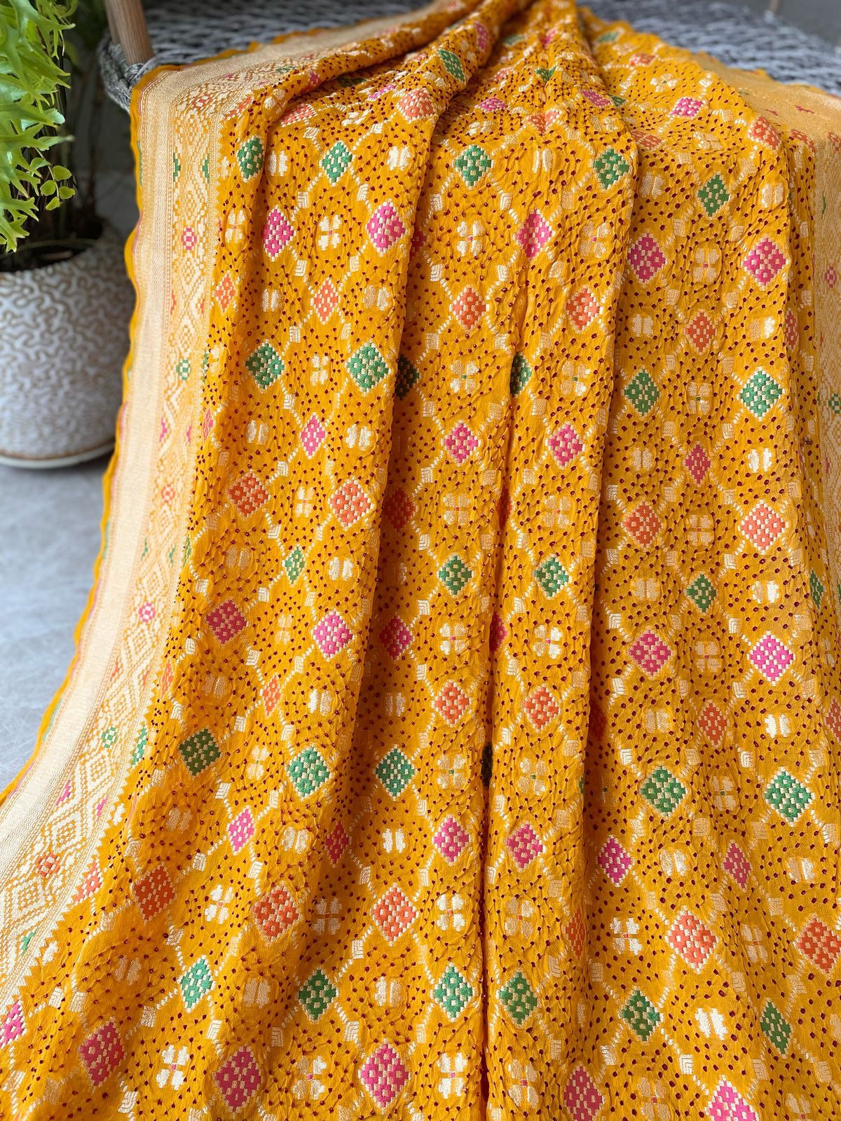 Kesari Yellow Color Pure Bandhani Saree with handwoven meenakari banarasi border