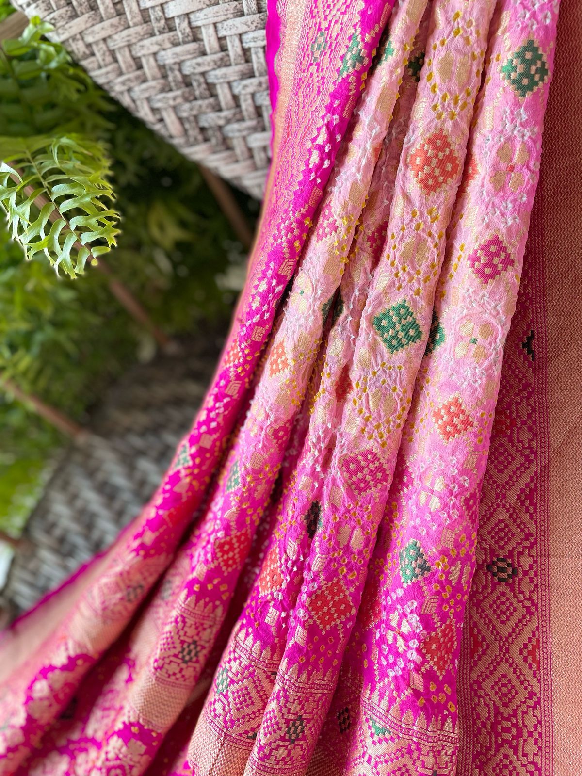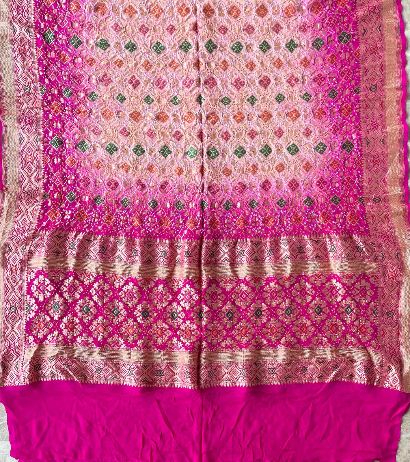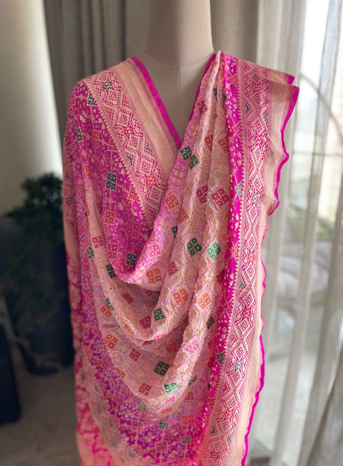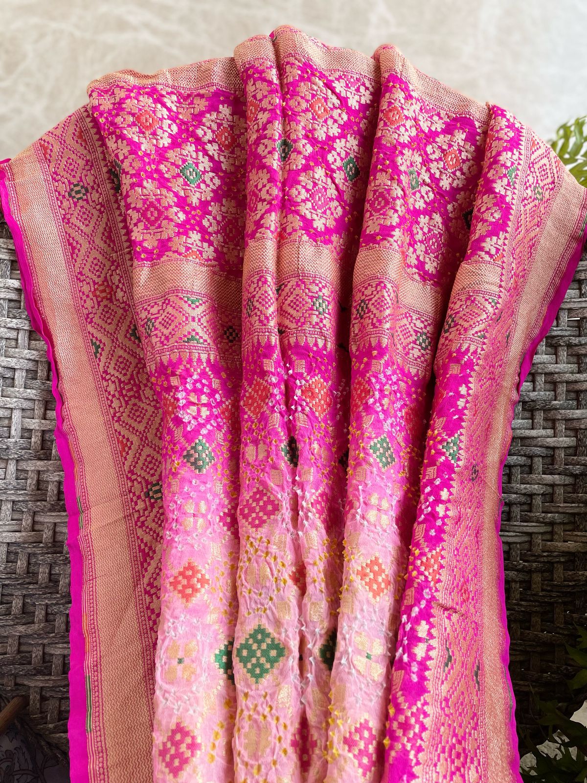 Ombre Shaded Fuchsia Pink & Peach color pure bandhani dupatta with Banarasi Meenakari weaving