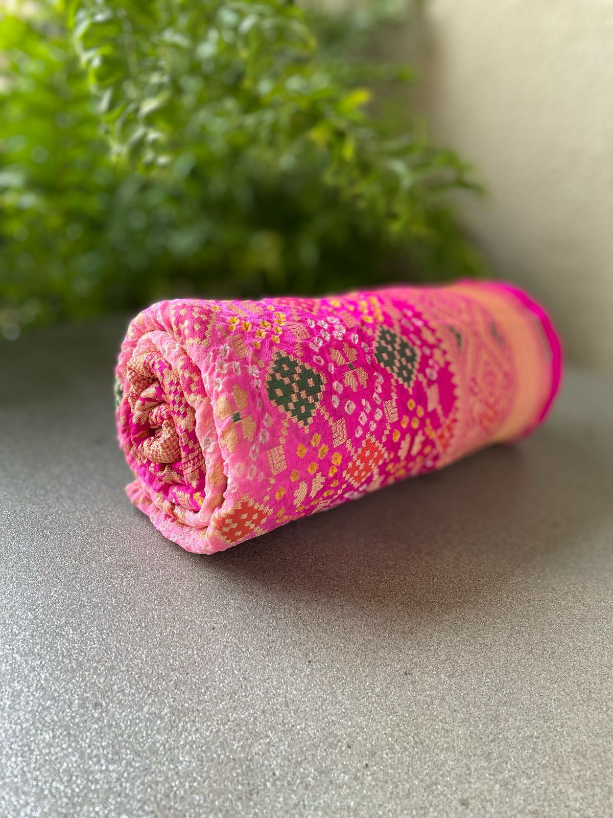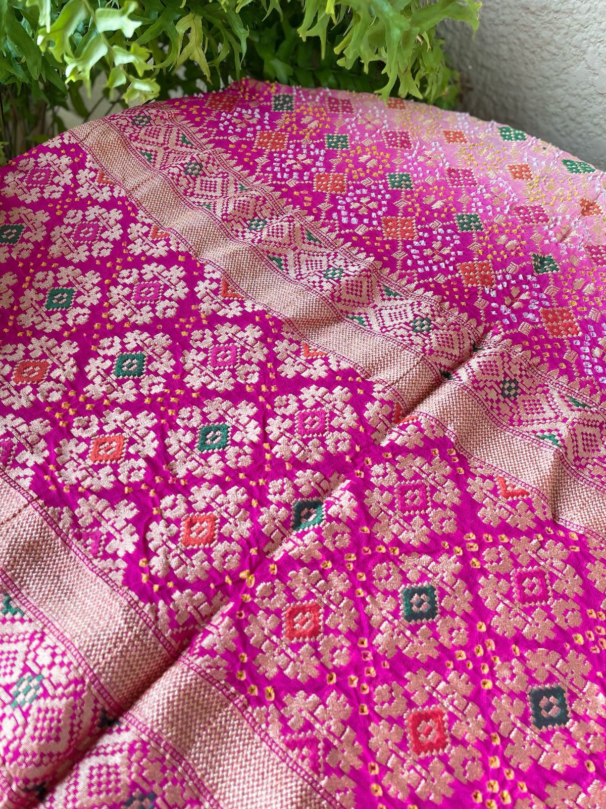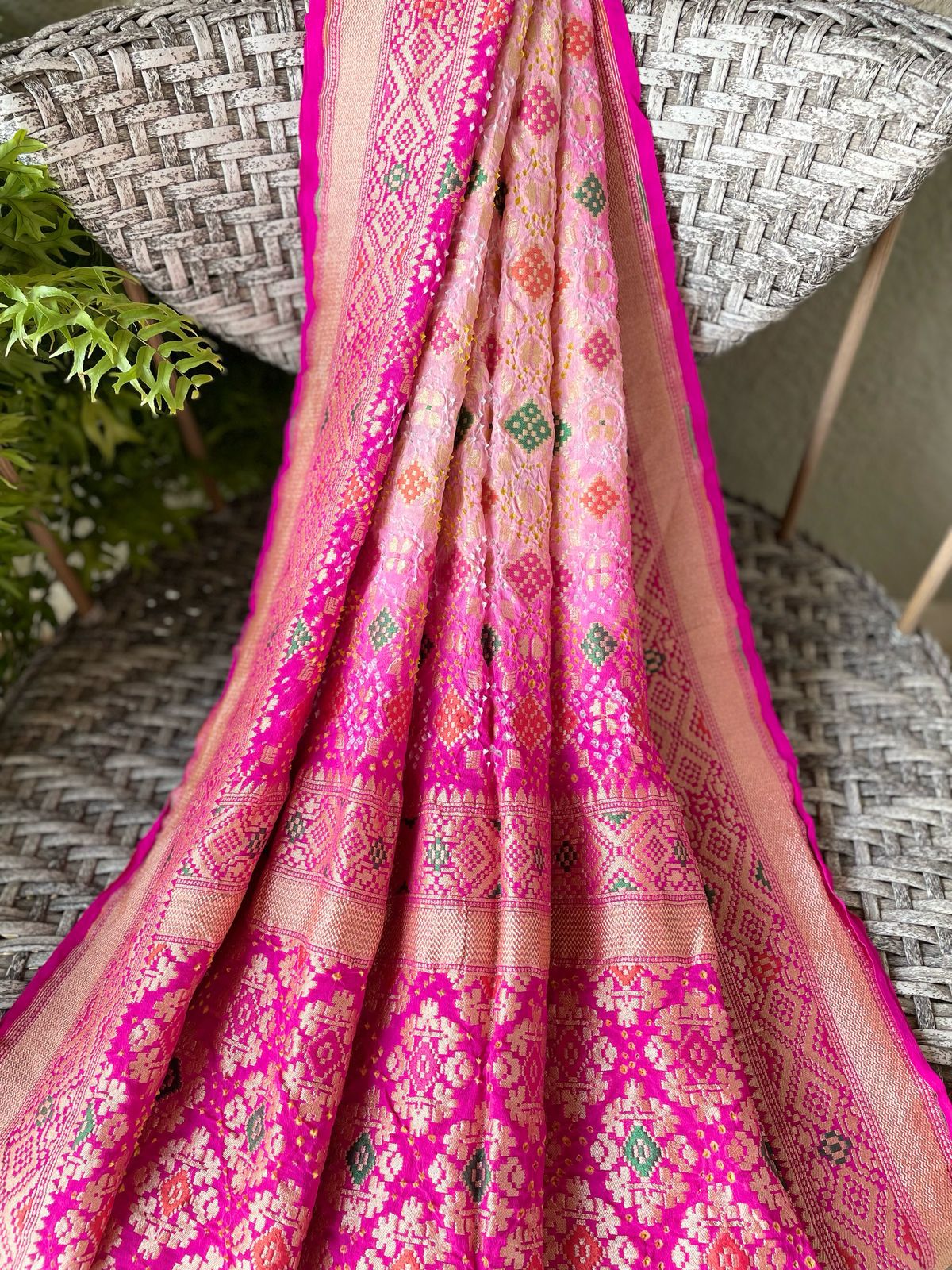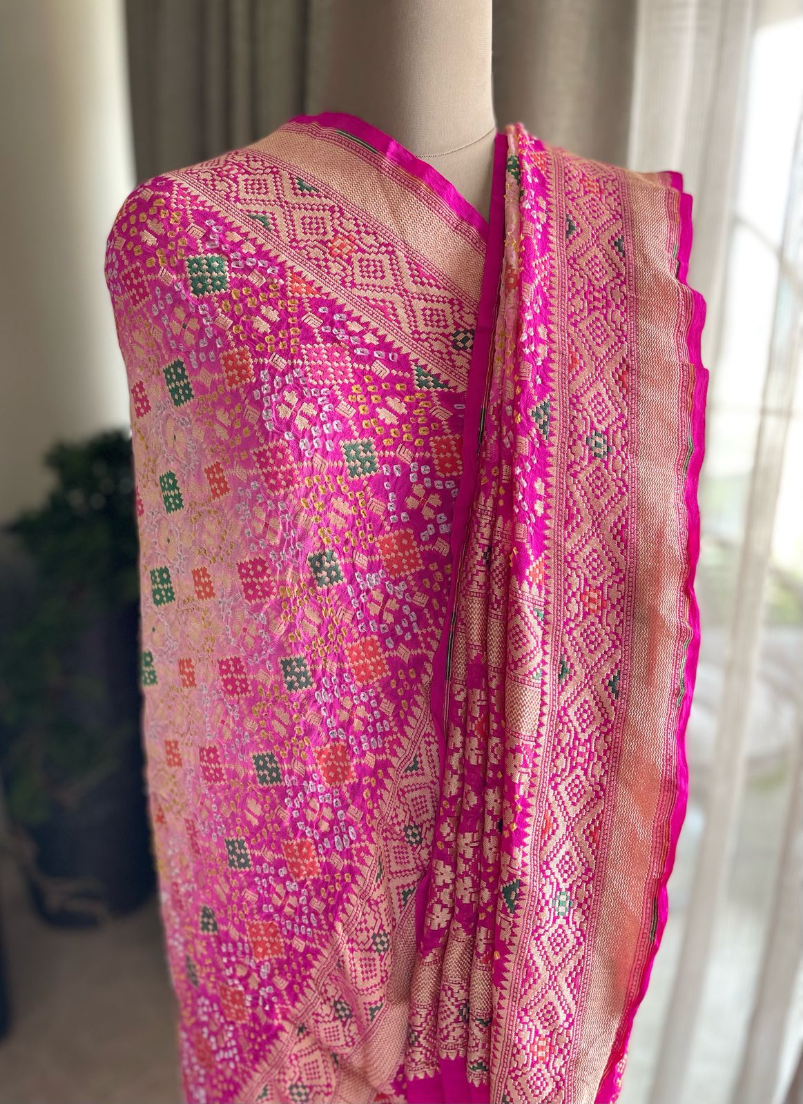 Ombre Shaded Fuchsia Pink & Peach color pure bandhani dupatta with Banarasi Meenakari weaving