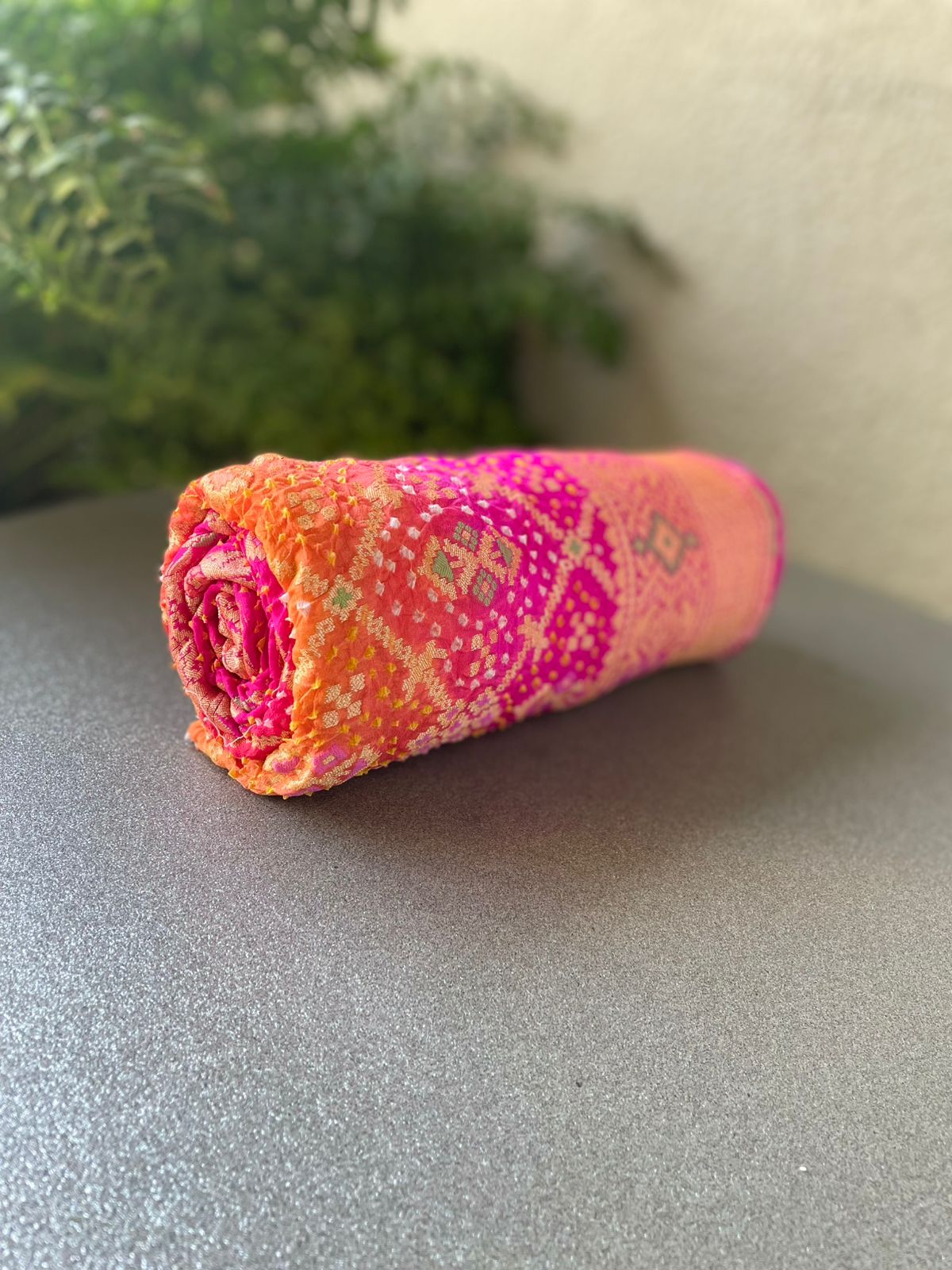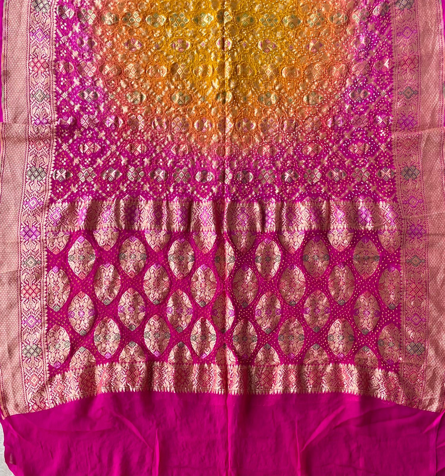 Ombre Shaded Fuchsia Pink & Kesari Yellow color pure bandhani dupatta with Banarasi Meenakari weaving