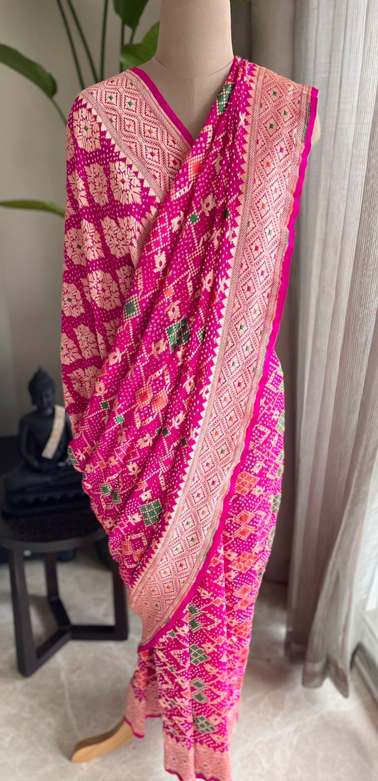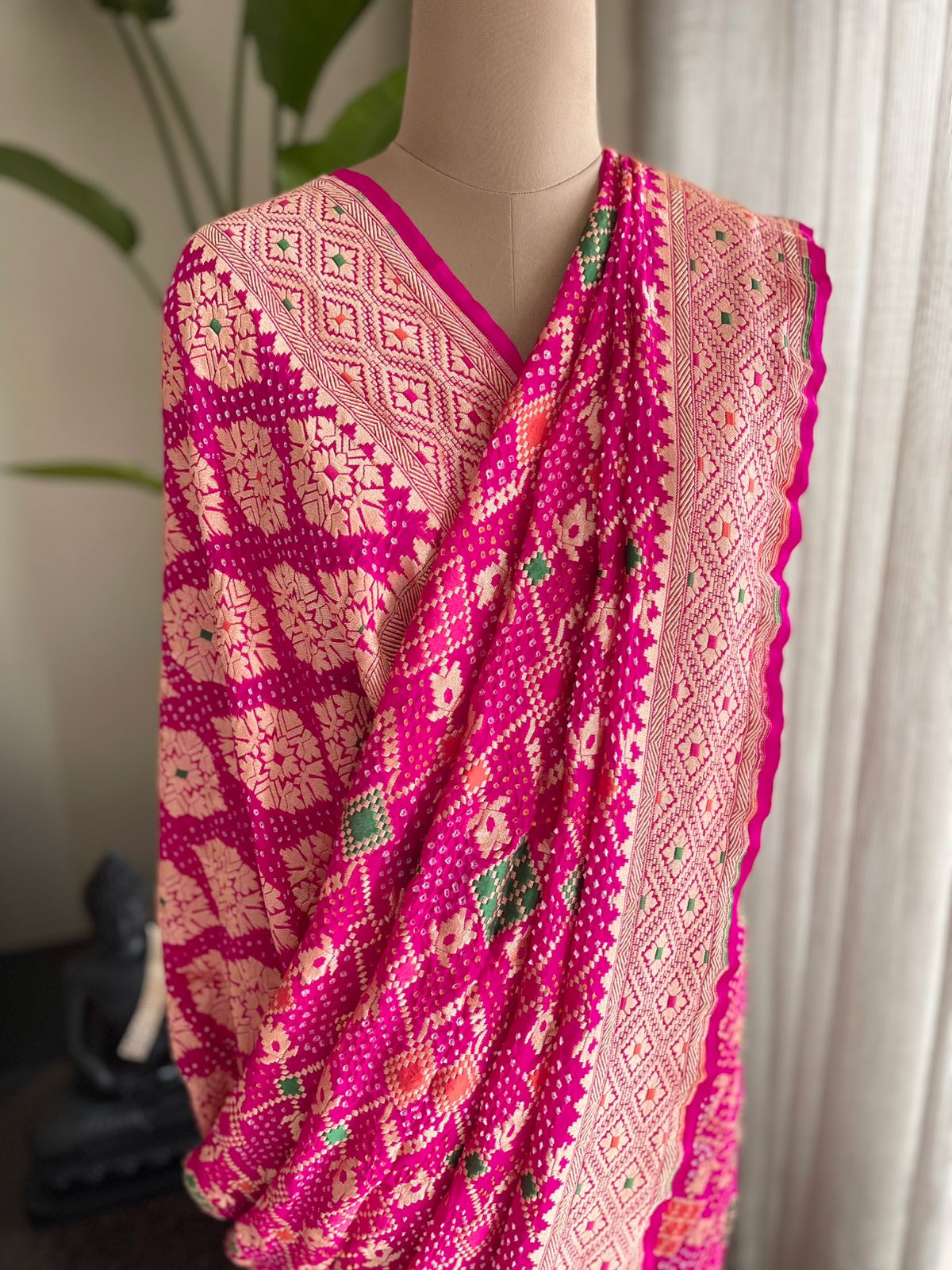 Fuchsia Pink color Pure Bandhani saree with handwoven meenakari banarasi border