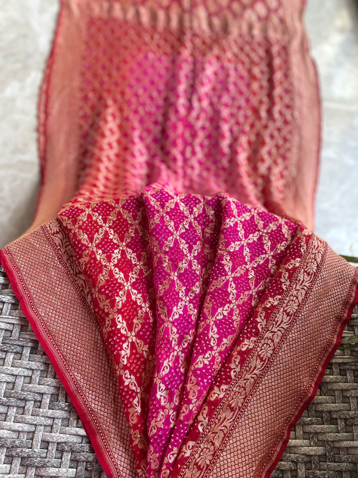 Ombre Shaded Red & Fuchsia Pink color pure bandhani saree with handwoven banarasi border