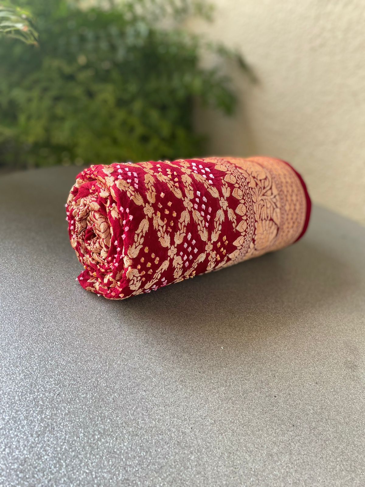 Fabric: Pure Georgette Rai Bandhej with Handwoven golden zari Banarasi weave