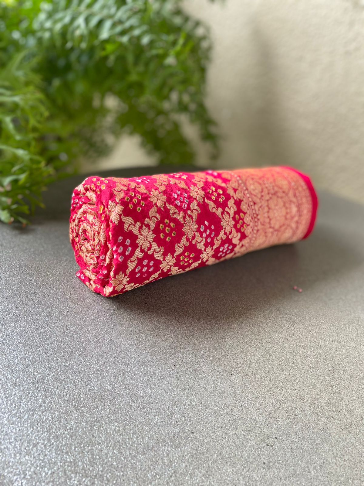 Raspberry Red Color Pure Bandhani Dupatta with Handwoven Banarasi border