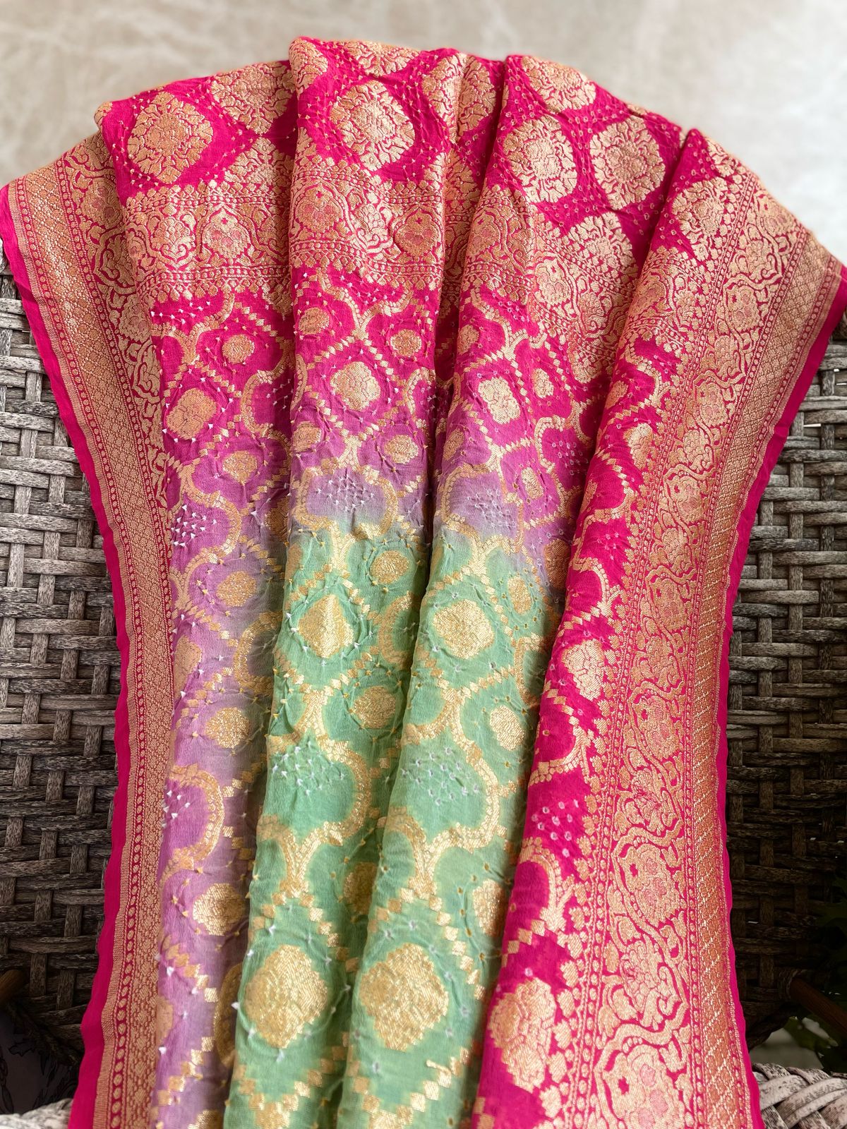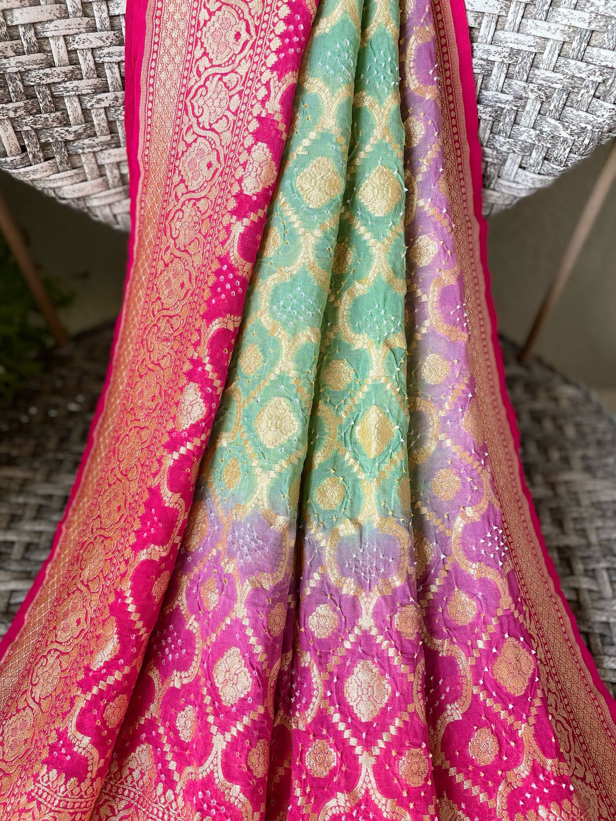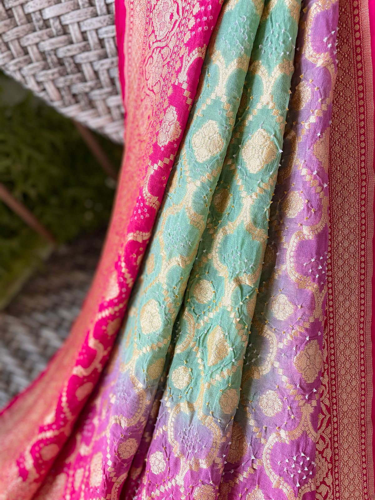 Fabric: Pure Georgette Rai Bandhej with Handwoven golden zari Banarasi weave