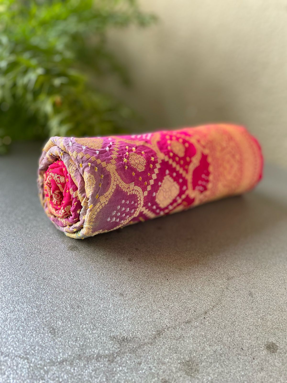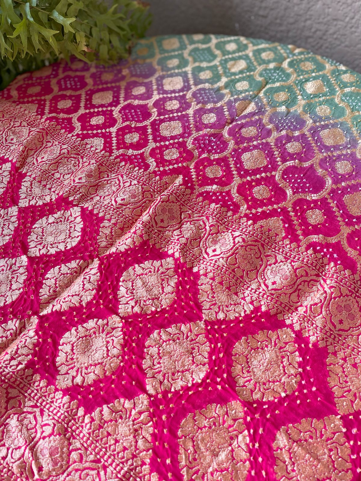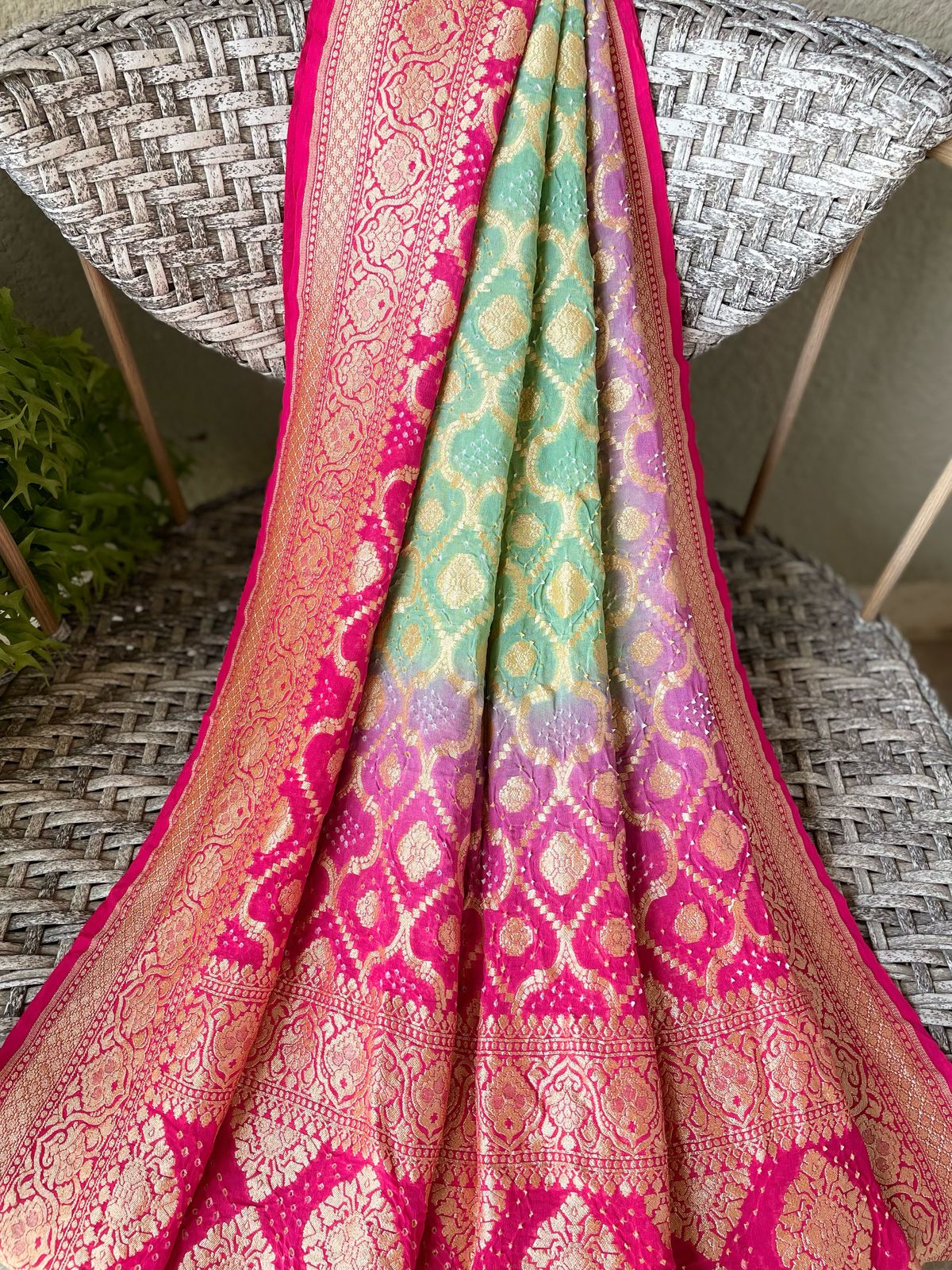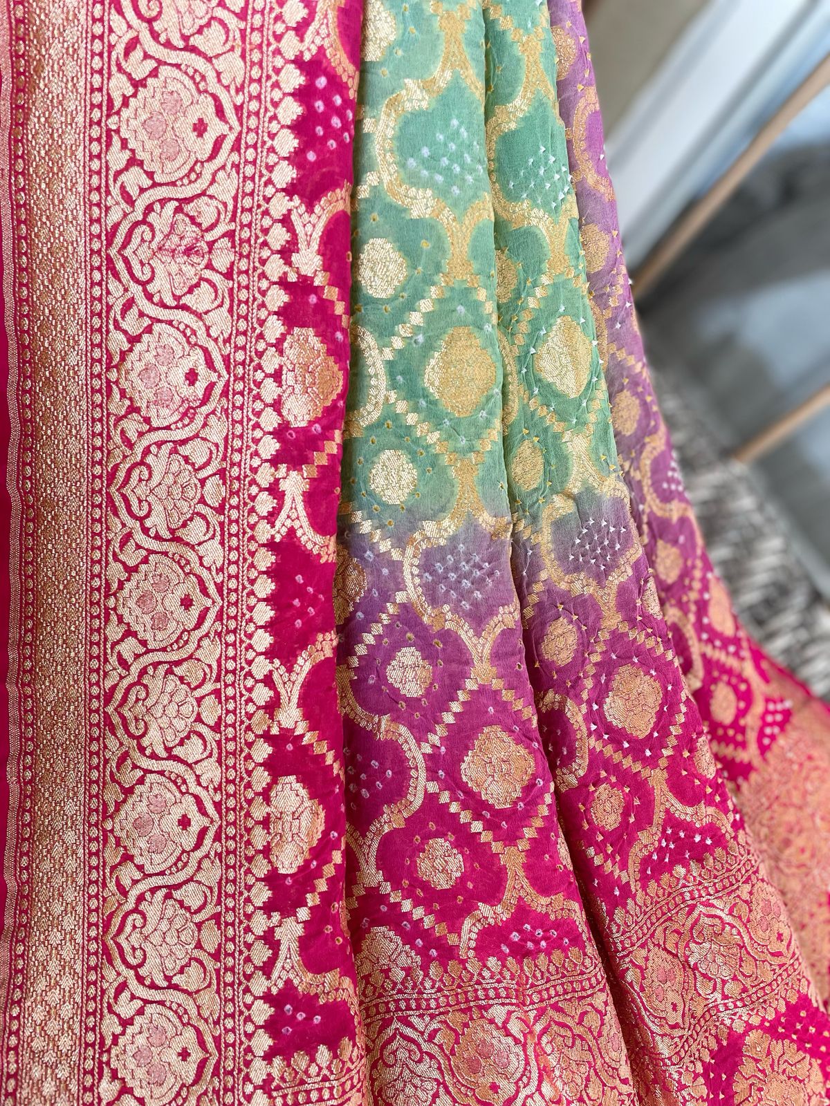 Fabric: Pure Georgette Rai Bandhej with Handwoven golden zari Banarasi weave