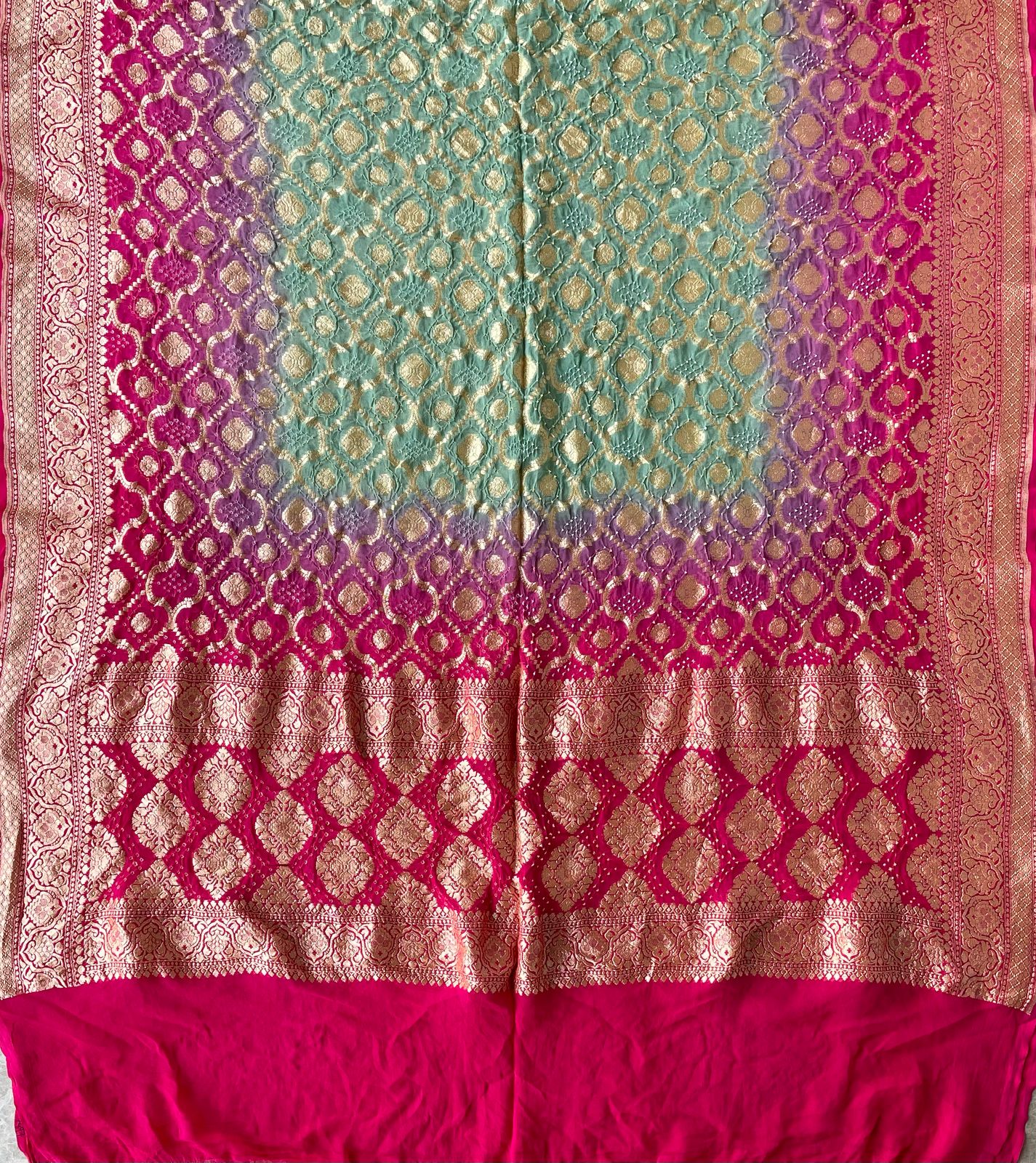 Ombre Shaded Raspberry Red & Sea Green color Pure Bandhani Dupatta with Banarasi Handwoven Border