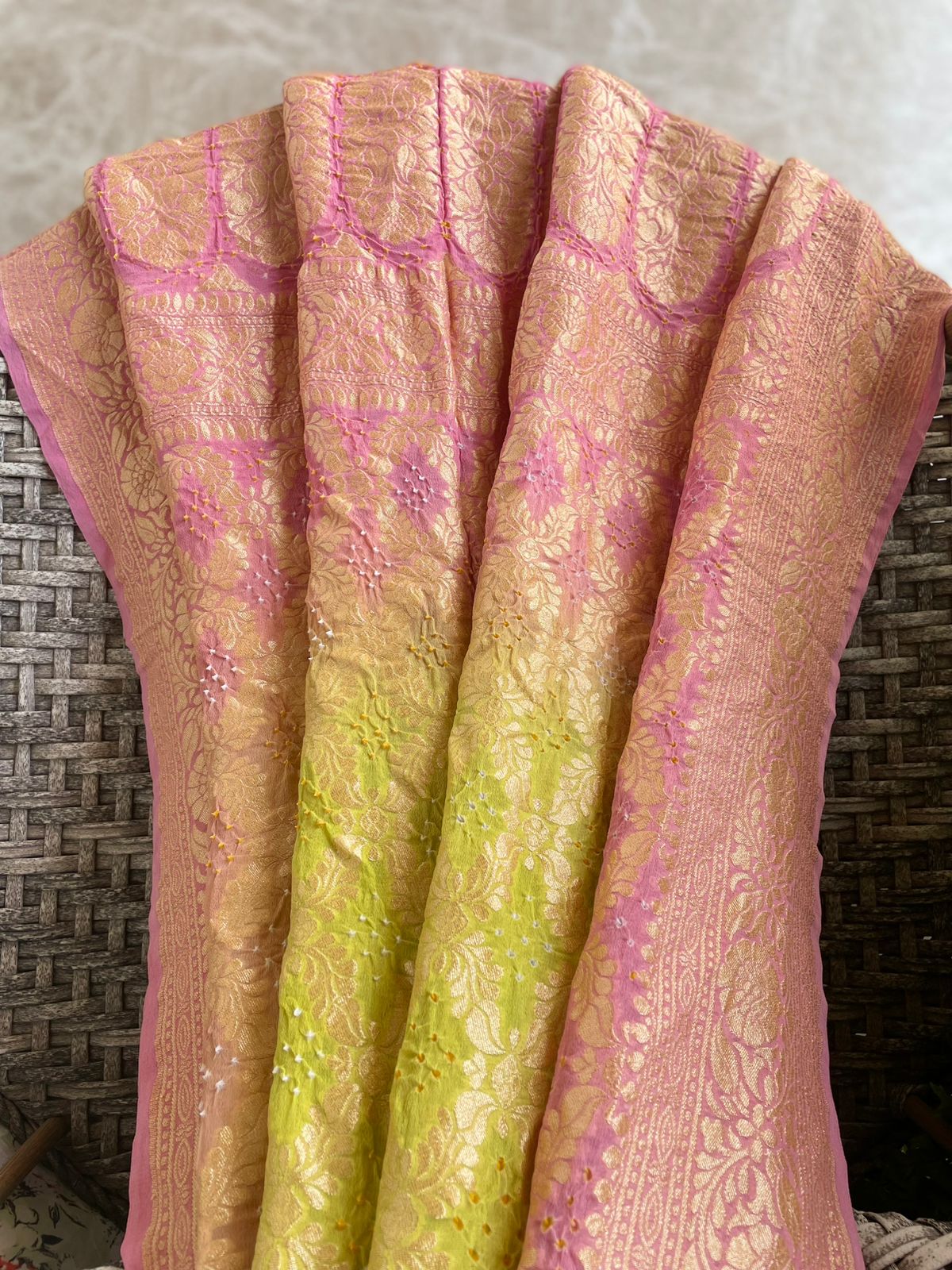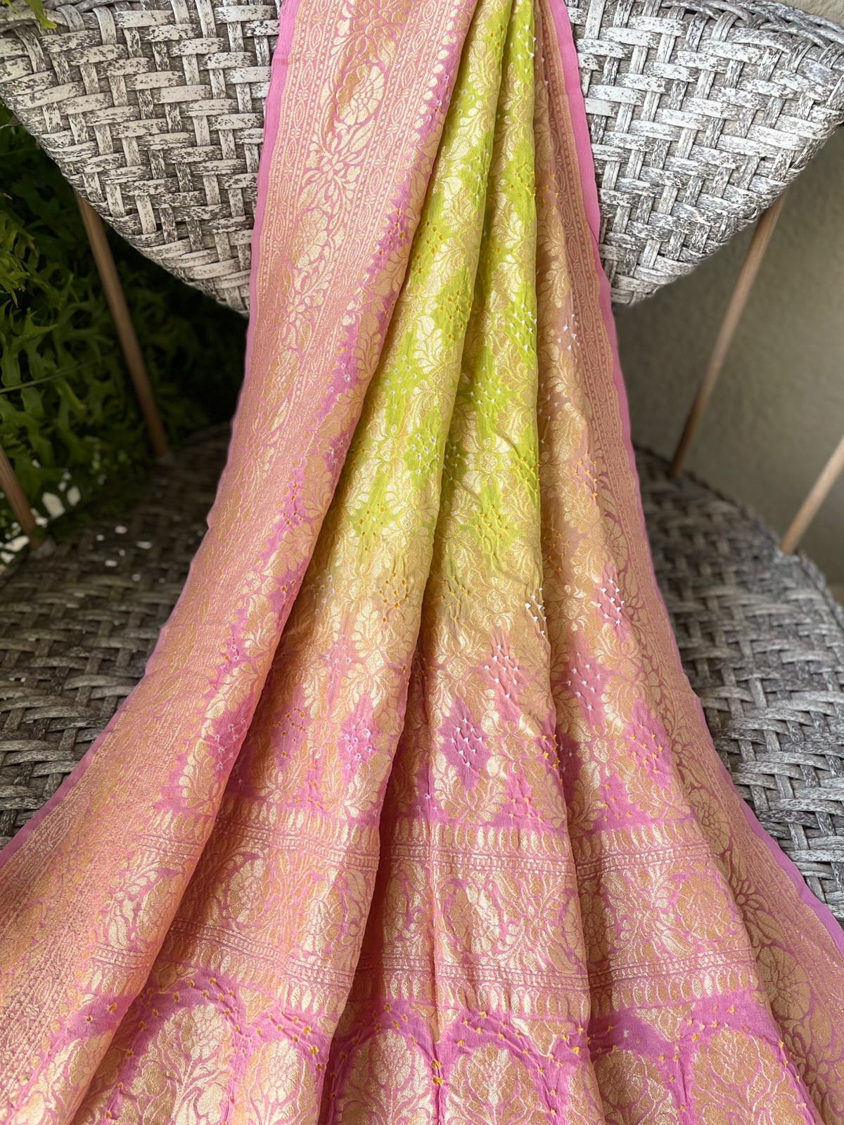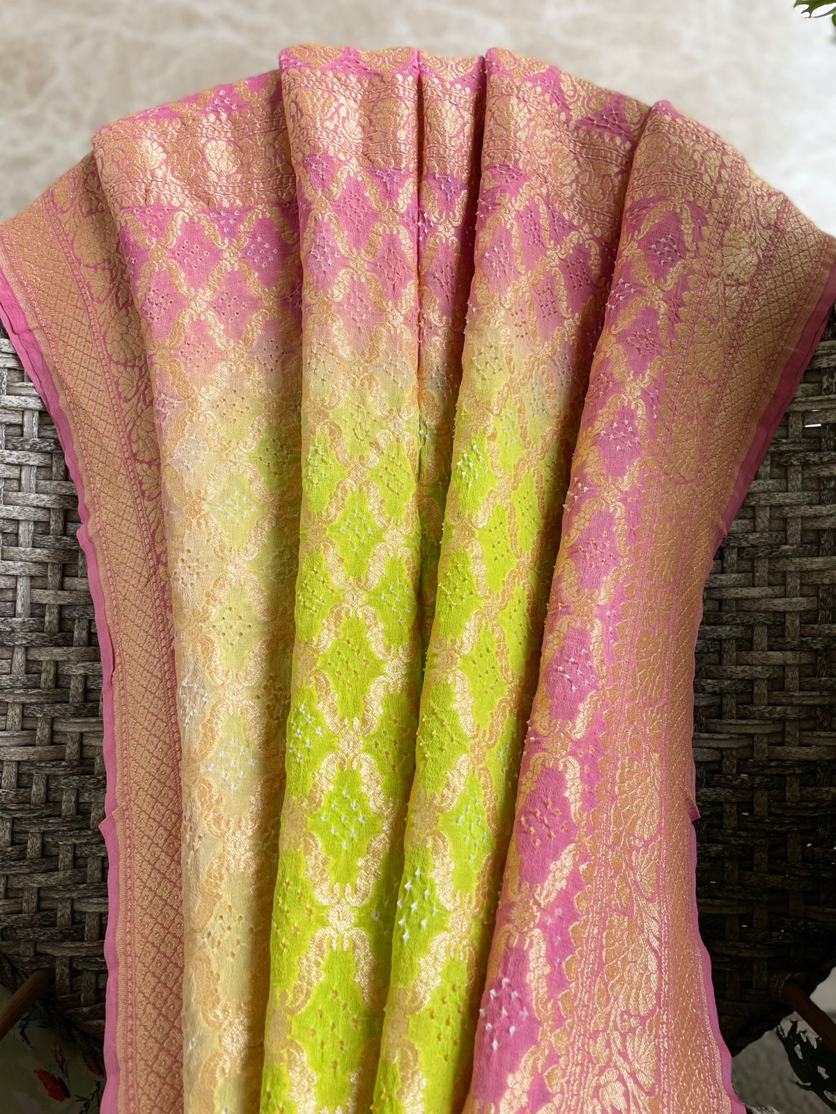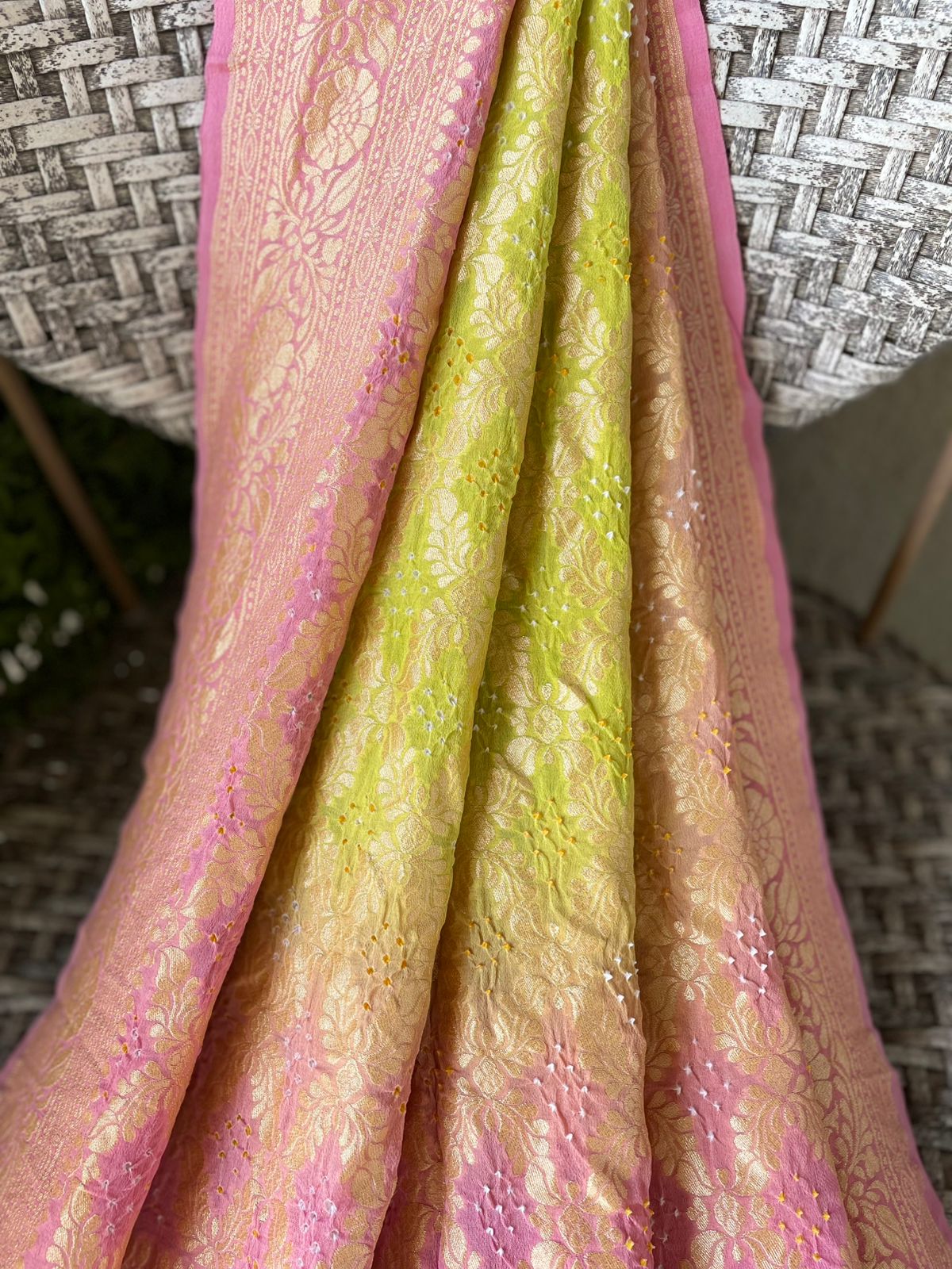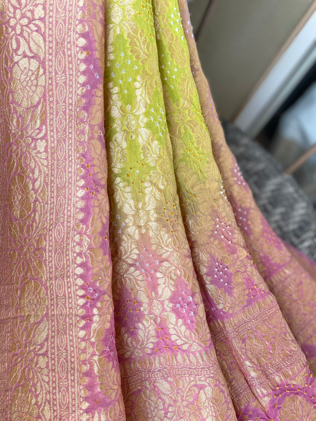 Fabric: Pure Georgette Rai Bandhej with Handwoven golden zari Banarasi weave