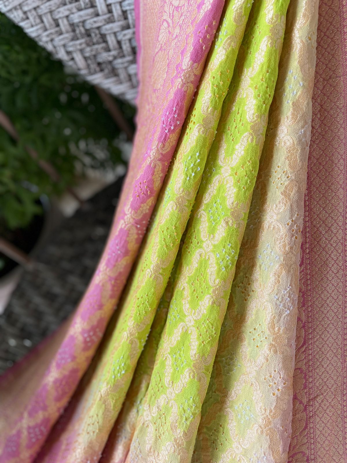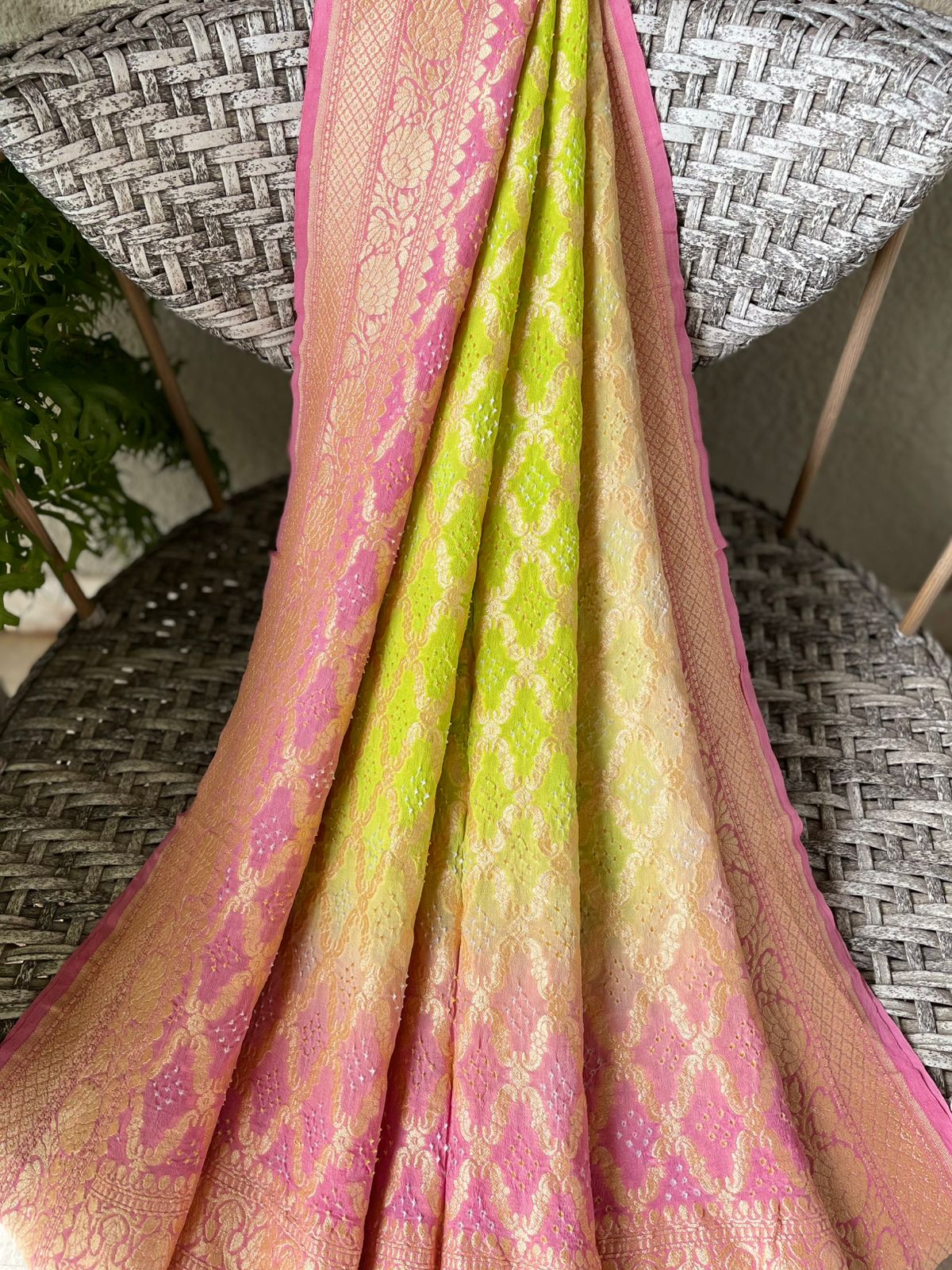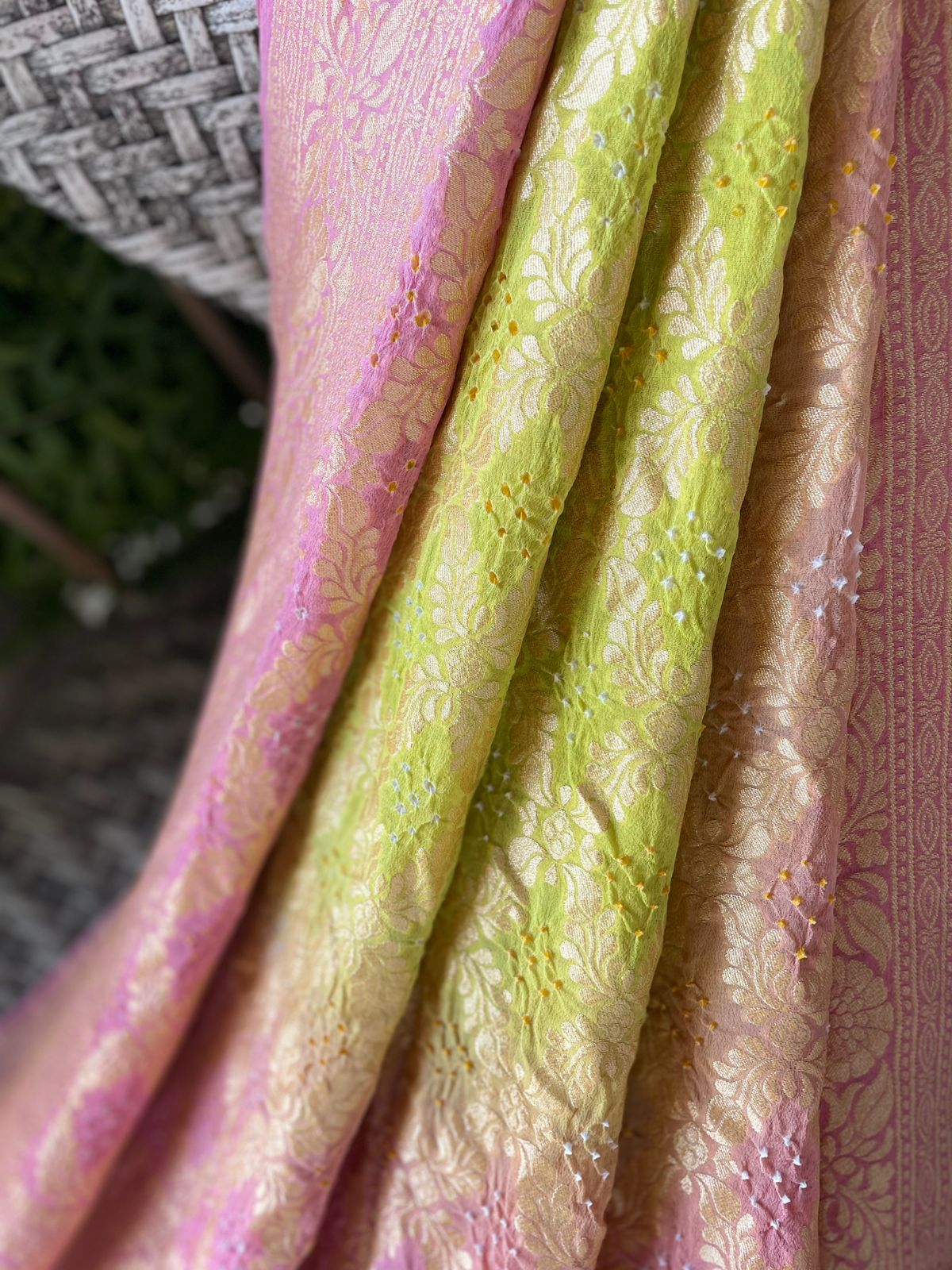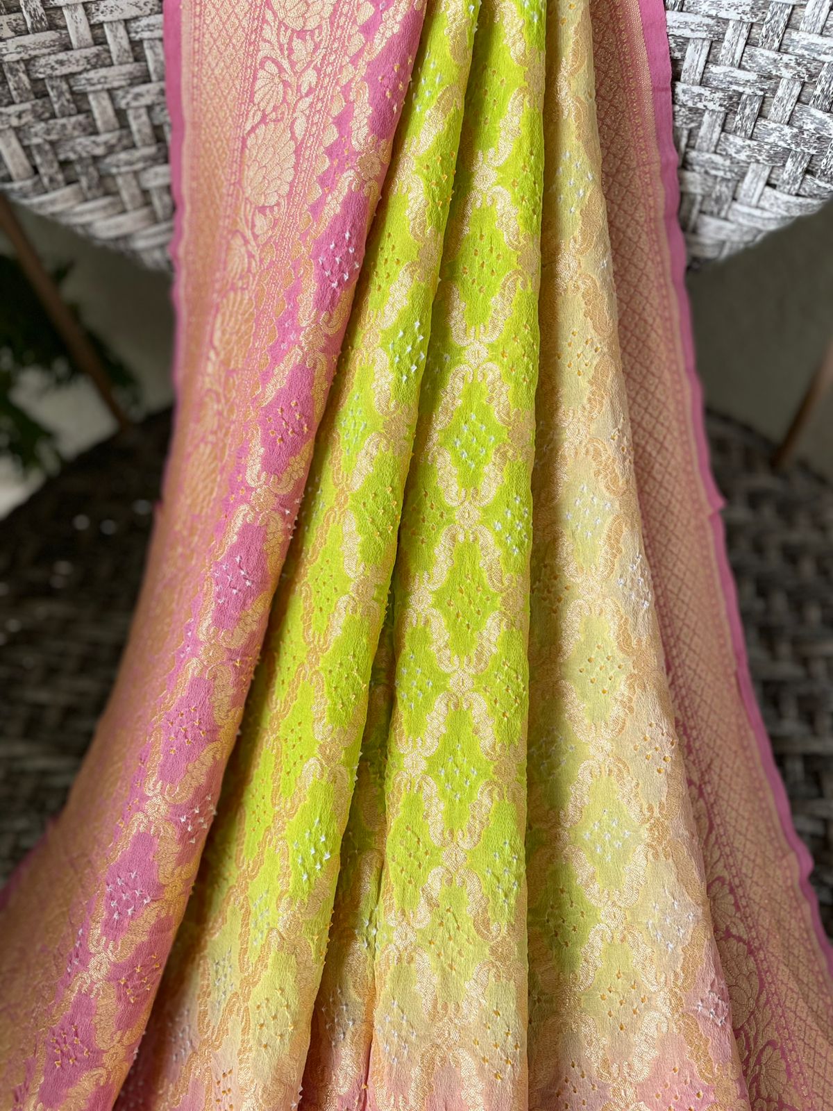 Fabric: Pure Georgette Rai Bandhej with Handwoven golden zari Banarasi weave