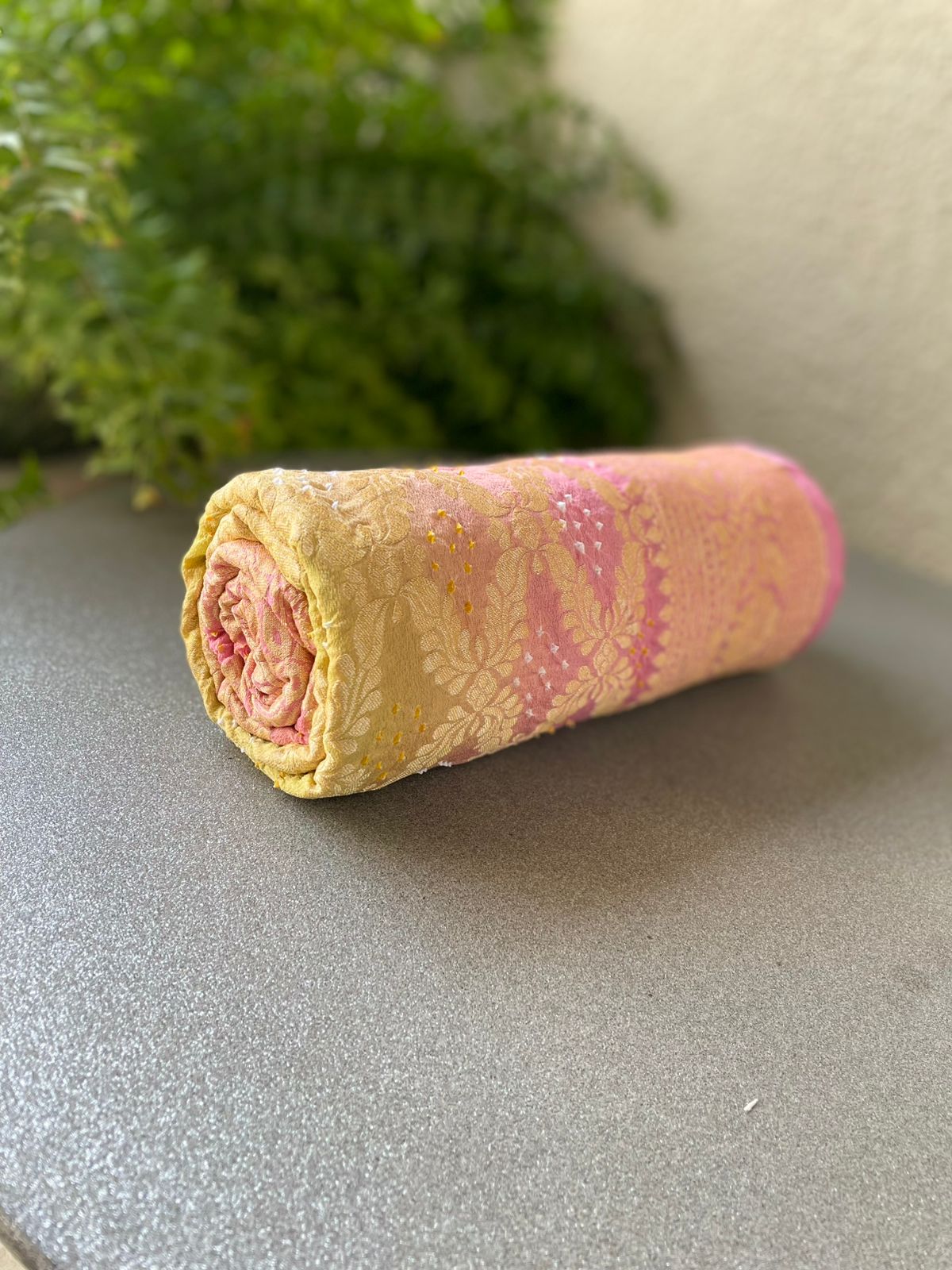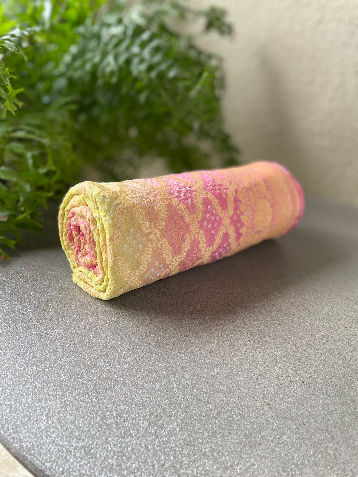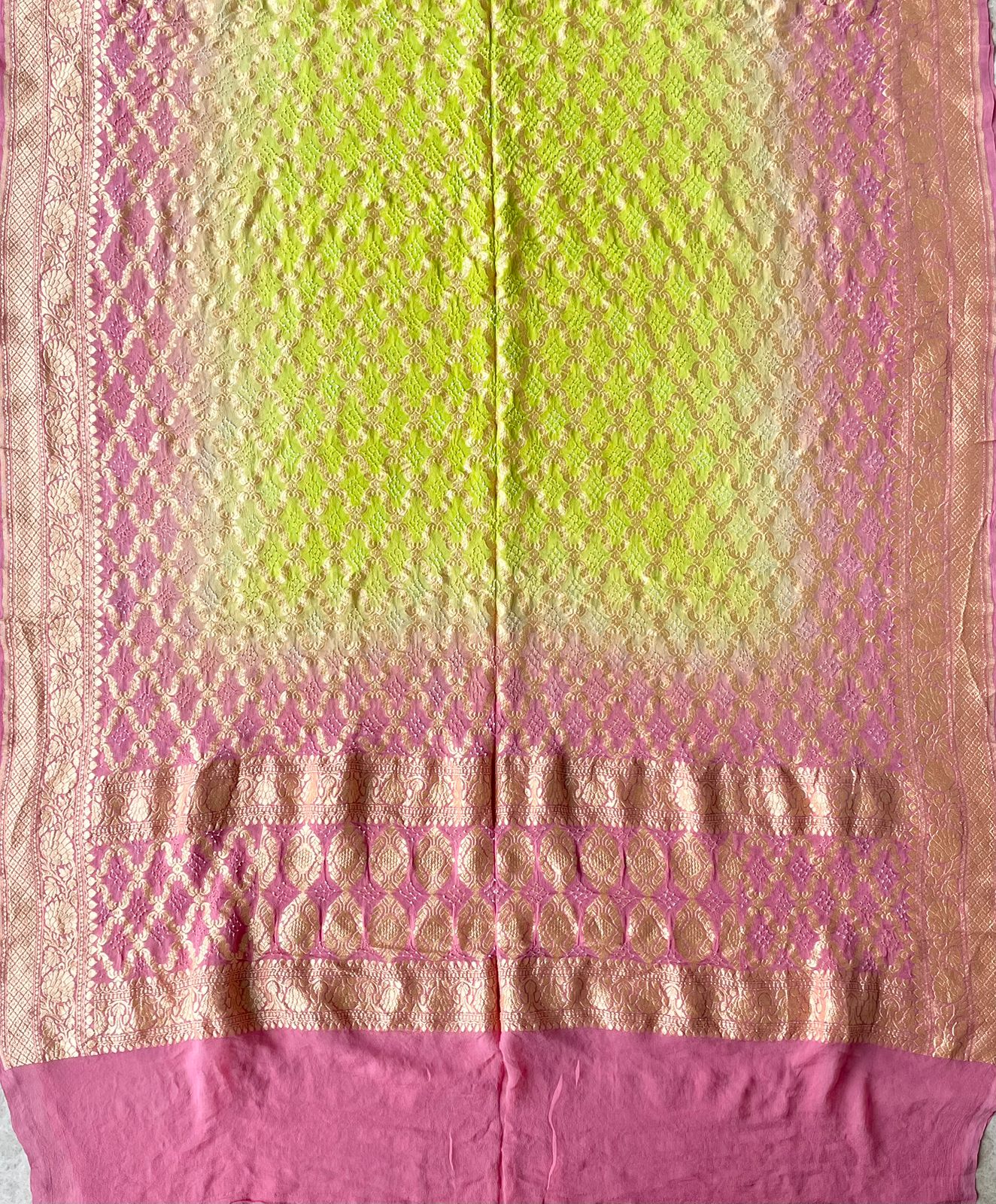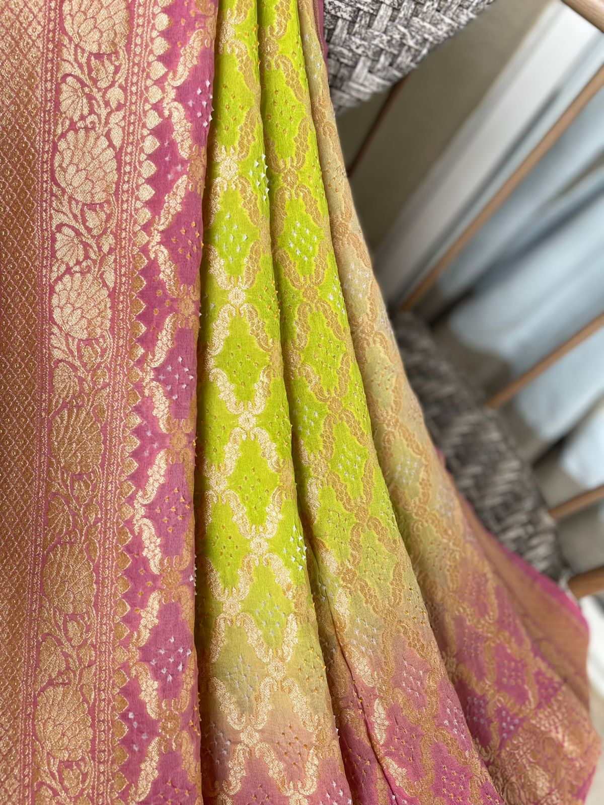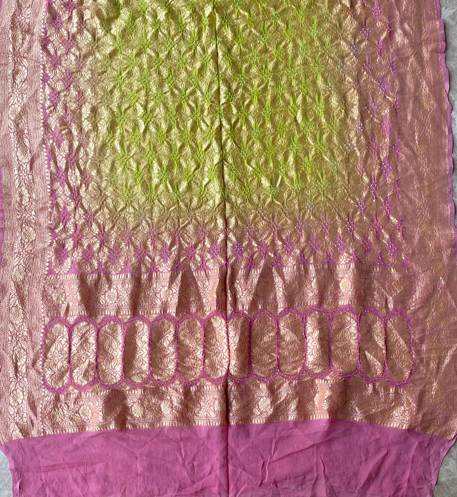 Fabric: Pure Georgette Rai Bandhej with Handwoven golden zari Banarasi weave