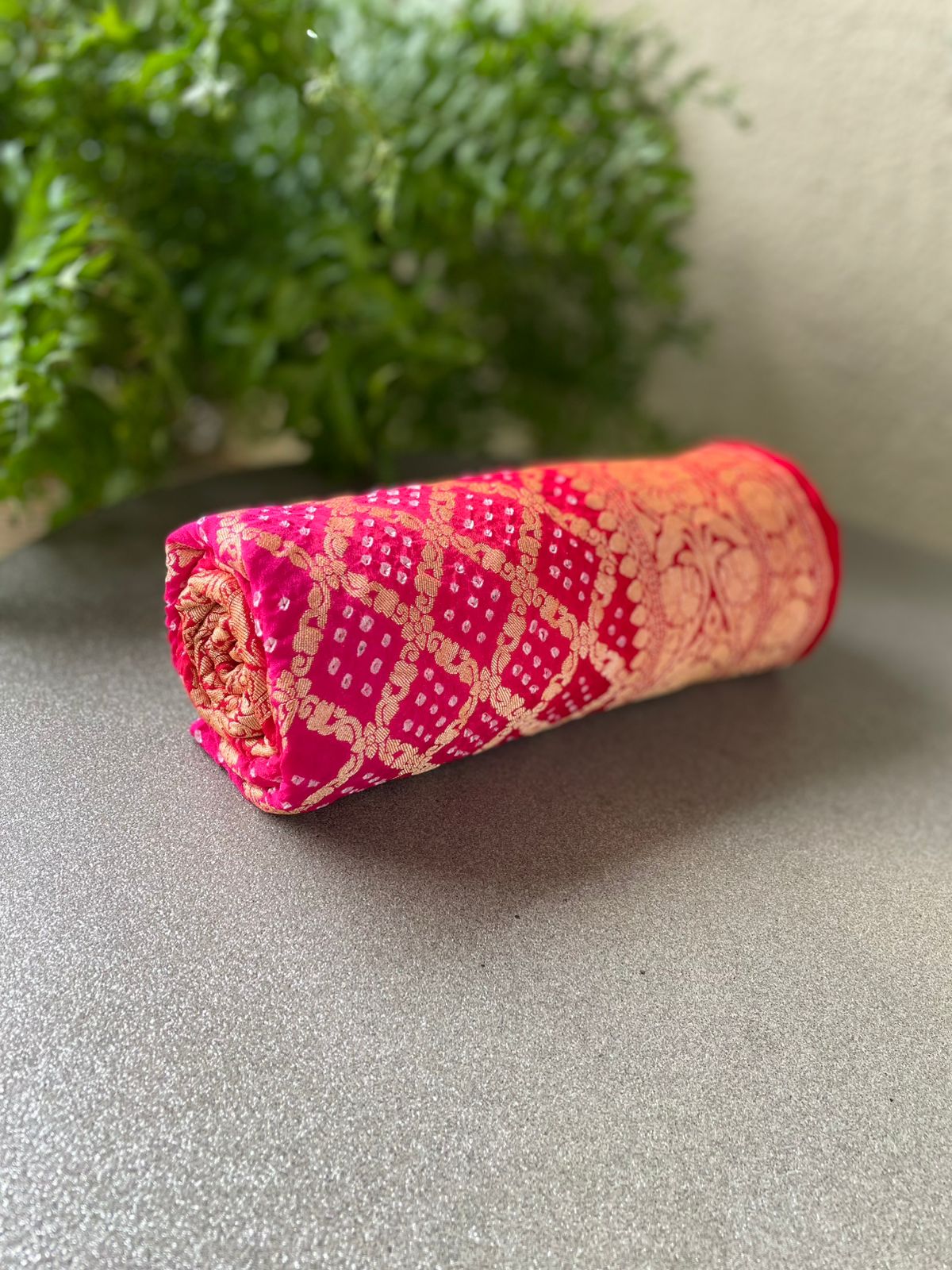 Fabric: Pure Georgette Rai Bandhej with Handwoven golden zari Banarasi weave