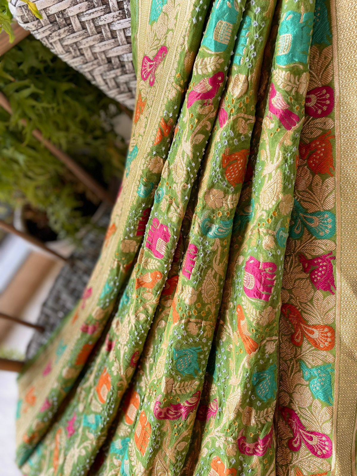 Sage Green color pure bandhani saree with handwoven meenakari banarasi border and Luxury Motifs