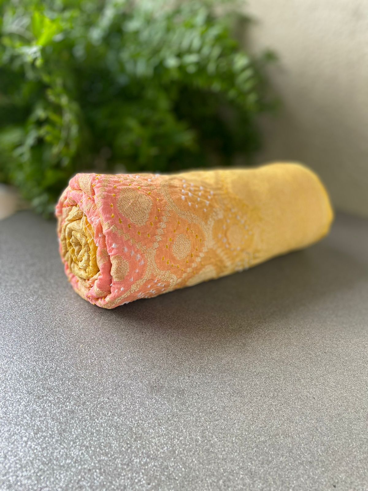Ombre Shaded Yellow & Peach color Pure Bandhani Dupatta with Handwoven Banarasi
