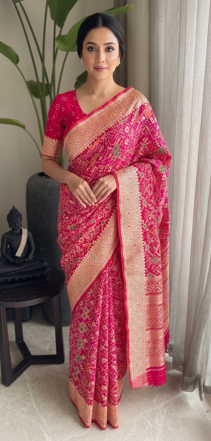 Product: Handwoven Pure Bandhani Banarasi Meenakari Saree with unstitched Blouse material