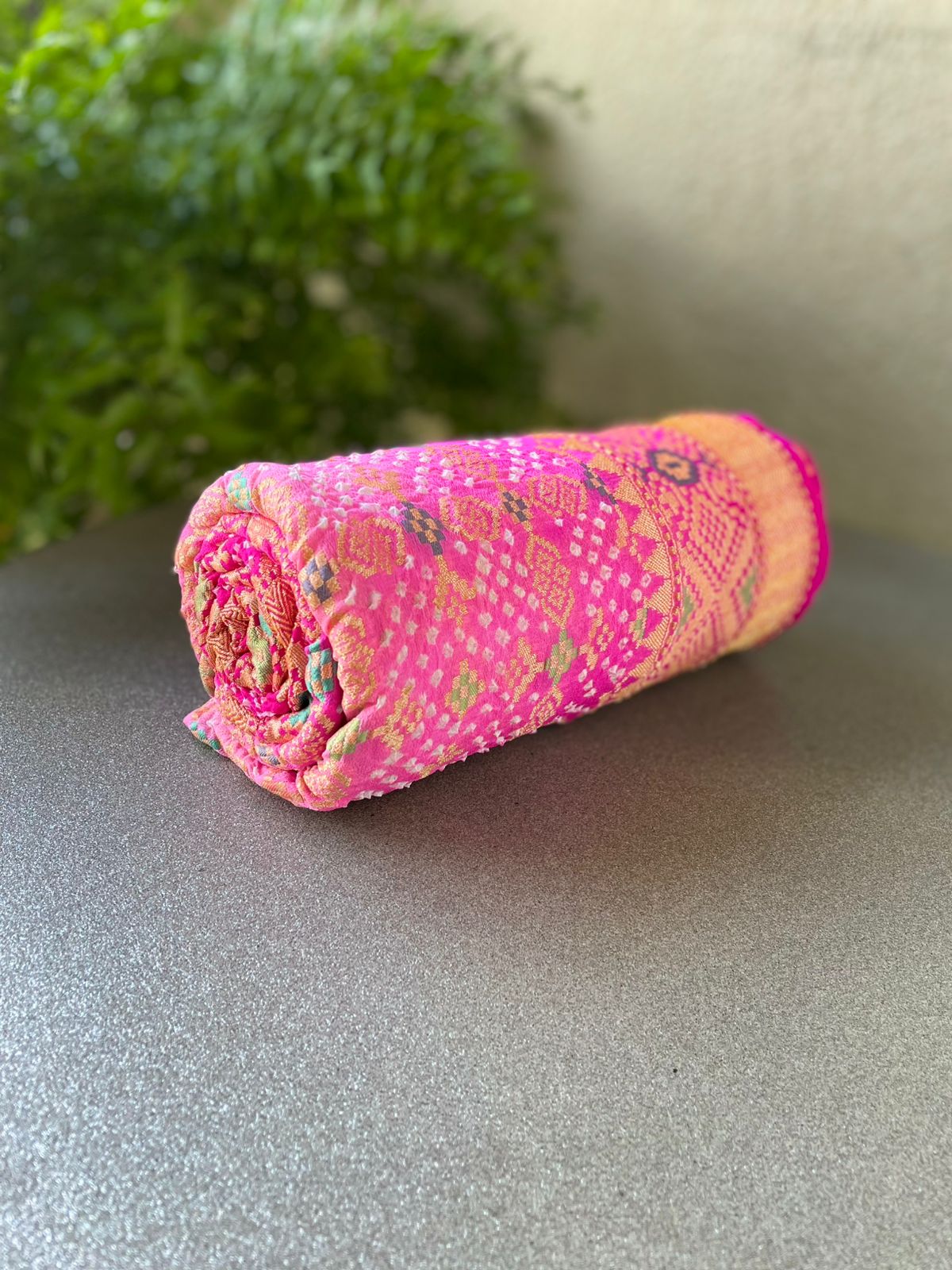Ombre Shaded Fuchsia Pink & Peach color Pure Bandhani dupatta with Banarasi Meenakari Weaving